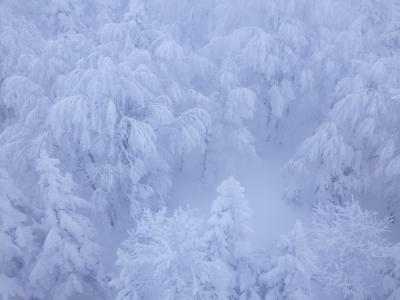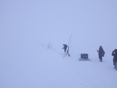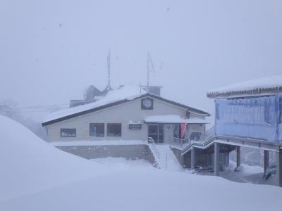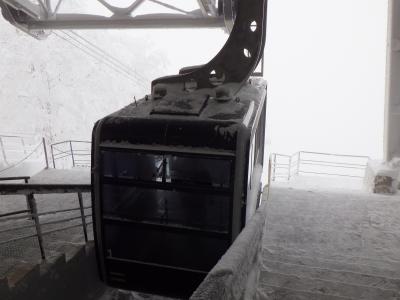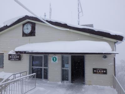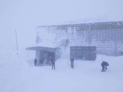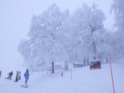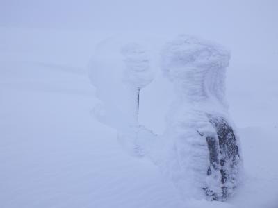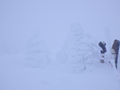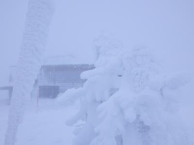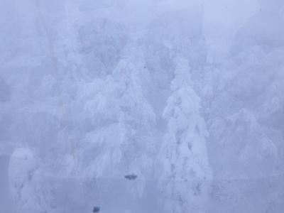 地蔵山頂駅から出るとホワイトアウト状況。雪に埋もれつつある蔵王地蔵尊を目指して歩くも断念して戻り始めたら、少し視界が開け、「スノーモンスター」を見ることができました。天気が良ければ旅行のパンフレットのような神秘的な世界を見ることができるのでしょうが。