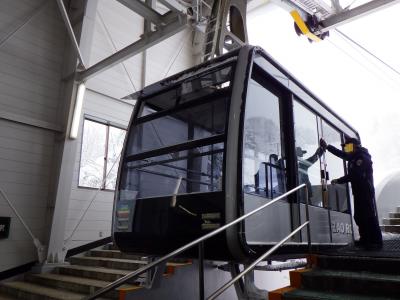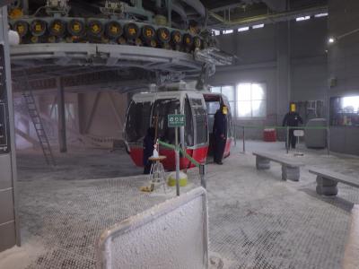 蔵王山麓駅から樹氷高原駅へ行くロープウェイ山麓線は、2台しか動いていないので、並んで待たなければならないのです(所要時間7分、最大乗車人員53人)。8時半の営業開始まもなくだったから20分待ちで乗ることができましたが、9時過ぎには1時間待ち、繁忙時は2時間待ちらしいです。下山してきたら、観光客、スノーボーダーの長い列、インバウンドにも人気らしいです。