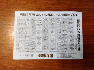 12時半開演から17時終演まで、漫才、漫談、コント、マジック、紙切り、曲芸、ものまねなど21演目を観覧。仲入り(10分程度の休憩のようなもの)が3回。チケットは2,500円(再入場不可)。思いのほか楽しめ、結構笑えました。