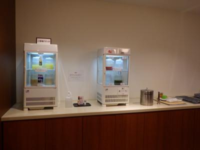 ロビーのウエルカムドリンク?さんぴん茶とシークヮーサージュース、製氷室のウォーターサーバーのお世話になりました。環境保全のため、客室のアルミボトルにお水を入れるようになっています。