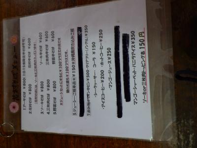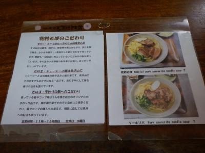 食事メニューはすべて800円で、アーサそば、花村そば、ソーキそば、三枚肉そば、野菜そば。アーサそば以外は半そば(600円)もある。ジューシーご飯は150円、セットならばプラス100円。