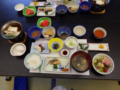食事は、中広間曲亭にて。畳の上に大きめのテーブルと椅子。隣との空間も十分ありました。地元と素材を使っているのはわかるけど、お品書きがないのが残念でした。