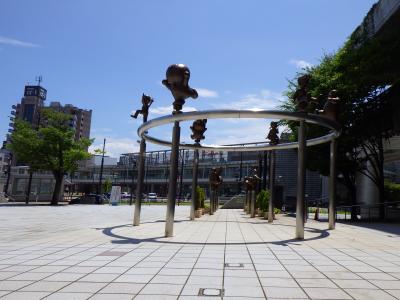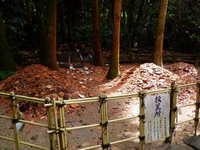 真夏の見学には、日傘と扇子は必需品かも。建物の外は日差しが強く、建物の中はすごく蒸し暑くて、室ジェクションマッピングを視聴している時だけエアコンがあります。