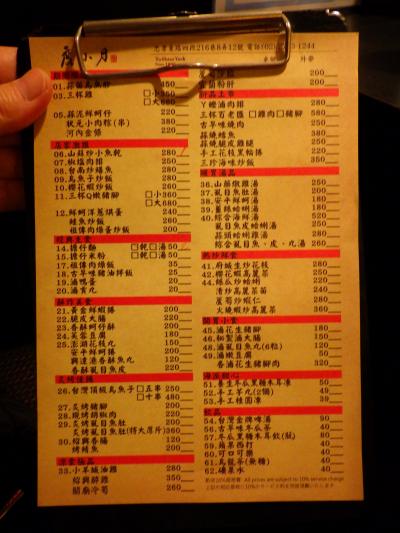 メニュー表紙下部に、一人最低100元以上の注文と10%のサービス料の記載があります。- 旅行時期