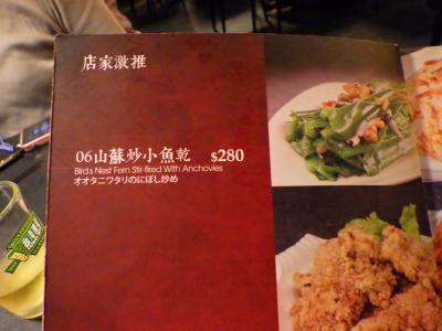 担仔麺の汁有と汁無、それぞれ$50、オオタニワタリのにぼし炒め$280、イカ団子のフライ$150を注文。