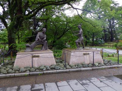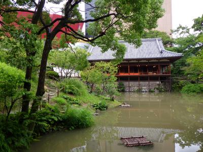 「池泉回遊式」庭園で、池面が低いはずなのに、大雨の影響でかなり水位があがっていてアジサイが池に沈んでいたのが残念。木造の書院の周りには近代的で個性的な建物が見えます。