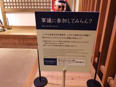 1Fは小倉城シアター・時代なりきり体験。入口を入るとシアターから草刈正雄さんのナレーションが聞こえる。「小倉城なりきり互版」は、お殿様、町娘、自分の服がどんどん変わっていく。「流鏑馬してみらん?」は、馬に乗って弓矢で的を射るゲーム。他にも色々な体験を楽しめて、こんなに楽しいお城は初めて。