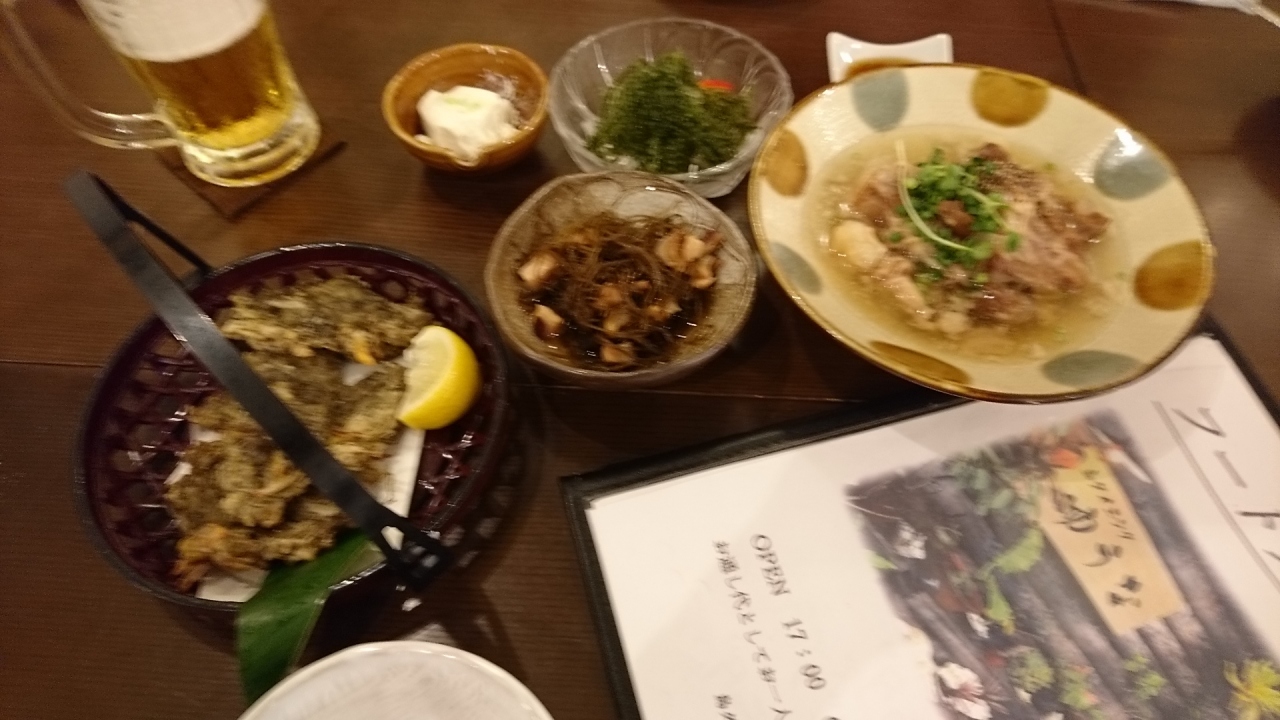 人気No1の軟骨ソーキマース煮、ジーマミー豆腐の揚げ出し、小浜産もずくの天ぷら、カーナと島タコのシークワーサー和え、海ぶどう、本日限定イカスミジューシー。