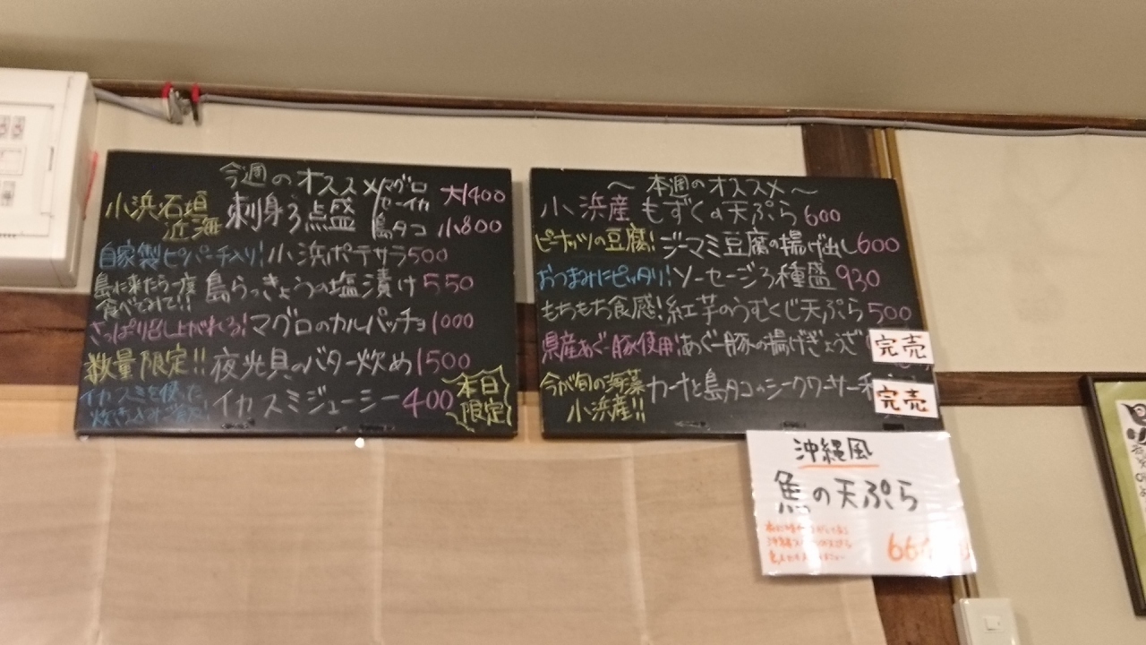 定番メニュー以外にも、黒板に今週のオススメが10品以上ありました。石垣島の泡盛もキレイなグラスにいっぱいついでくれます。「島うらら」が好きと言ったら、写真撮影用に一升瓶を持ってきてくれました。
