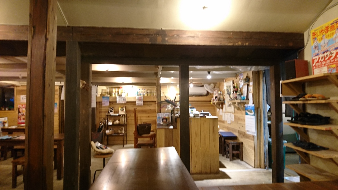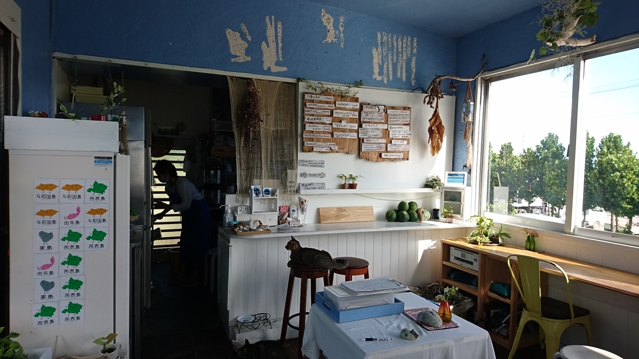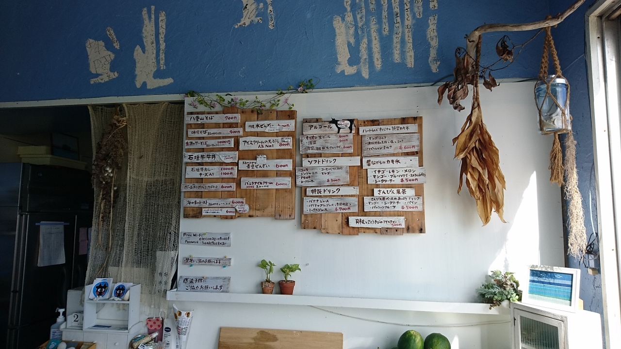 黒島港の向かいにあるカフェ。店内にはカウンター席とテーブル席、外にもテーブル席があります。ドリンク、かき氷、ビール、そば、カレーなどがあり、飲食店の少ない黒島では貴重な存在のようです。