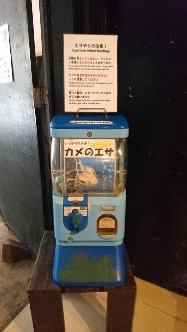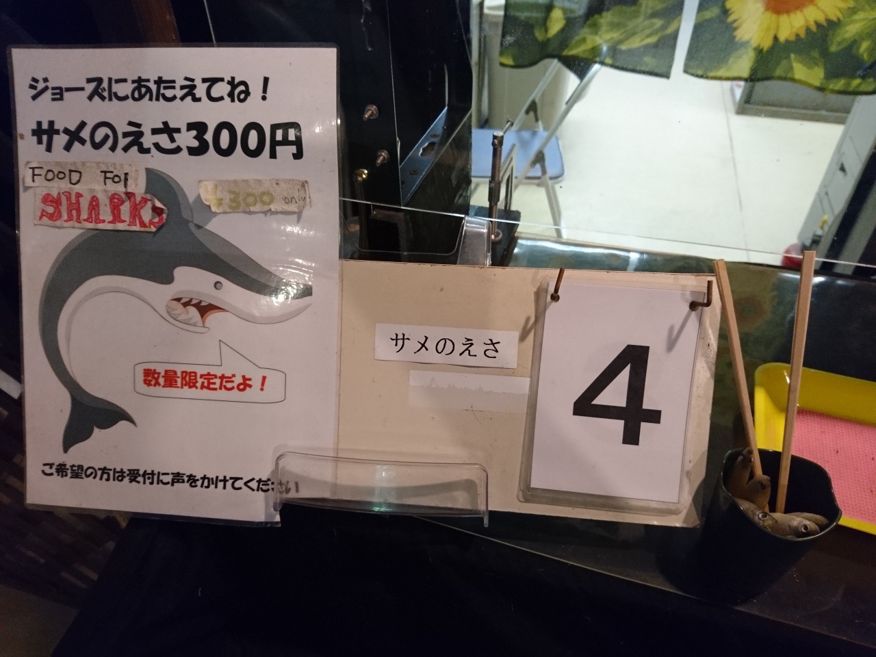 楽しみは、サメ(300円)とウミガメ(200円)に餌やりができること。入口で買ったサメの餌はイワシのような小魚で、外の水槽で飼育されているサメに割り箸で与えます。エサやりの注意書きのとおりエサを投げ入れないと手を噛まれるリスクがあります。エサをあげていると、サメもカメもどんどん集まってくるので、間近でみることができました。他ではできない経験を楽しみました。