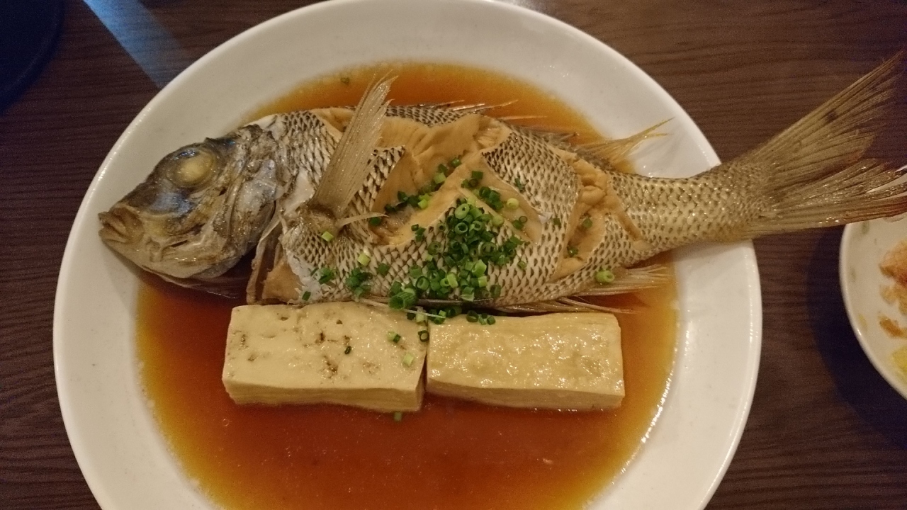 さしみ盛500円安くて新鮮。島豆腐。大きなアーサのかき揚げ。大量のもずく酢。迷った挙げ句注文した煮付け。魚の種類を聞いたら「フエダイ」だったかな?メニューには800円から。聞いてみたら「大きさによって」と。値段がわからないものを注文するのはリスクあるけど、旅の勢いで!できあがるまでに時間かかったけど、すごく美味しかったです。