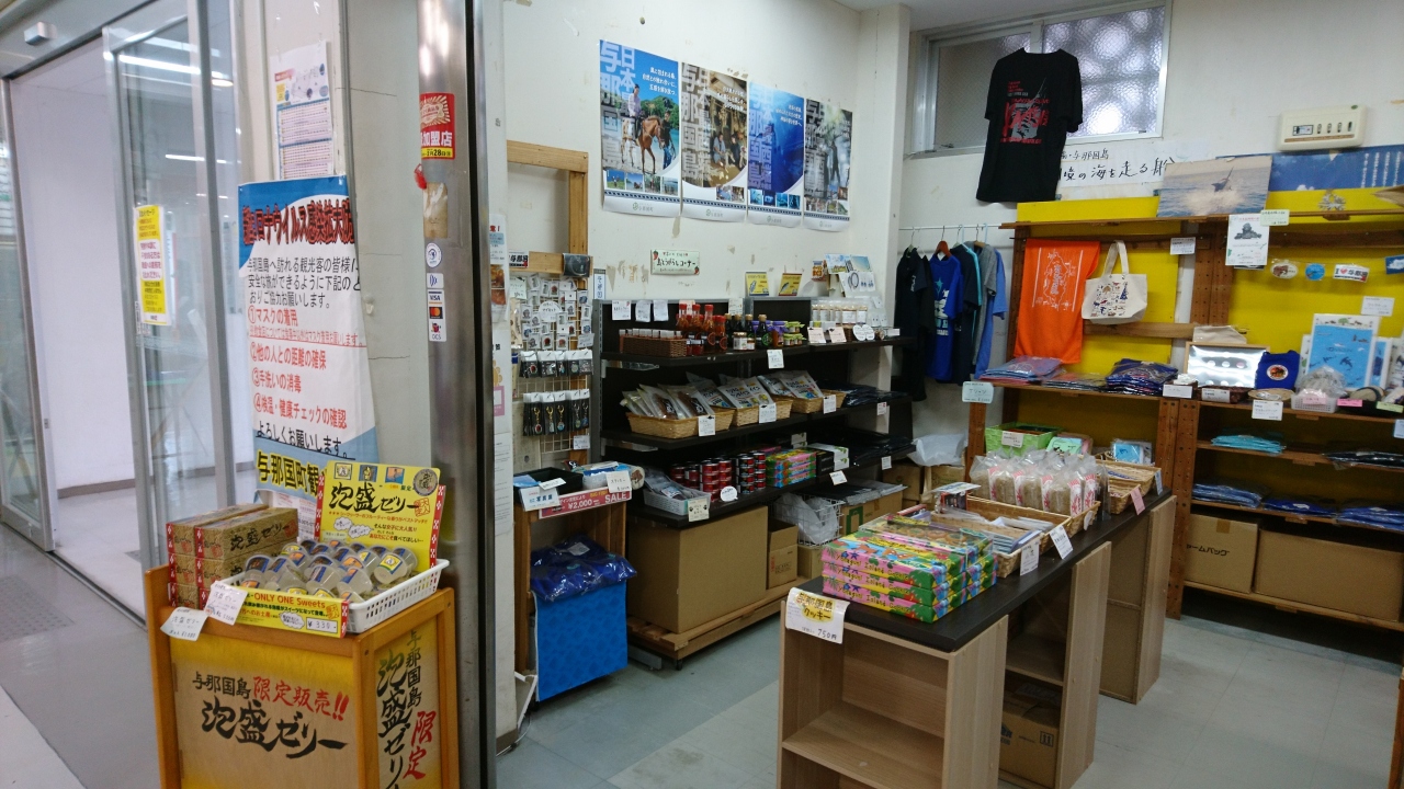 空港にはレンタカー店、数件の小さな売店があり、与那国土産が揃っています。ほとんどが飛行機の発着に合わせて営業しています。島内ではお土産を買うところがなかったので、与那国島記念切手シート、Tシャツ、黒糖、缶詰、泡盛、クバ餅、かまぼこを買いました。