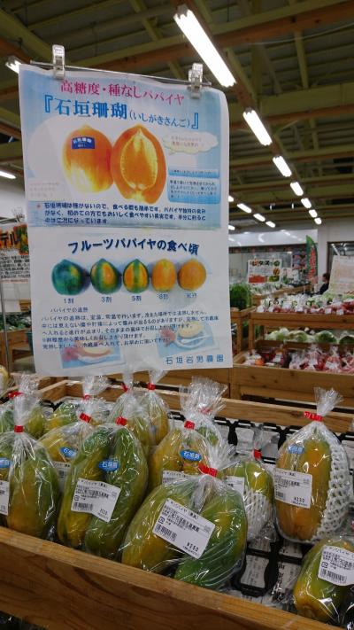 離島ターミナルから徒歩10分程度、市役所の近くにある、JA沖縄が運営する農産物直売所です。新鮮な石垣島産の野菜や果物、肉、スイーツ、土産などが販売されています。生産者が直接持ち込み、並べていました。とにかく、新鮮で安くて種類豊富で、見たこと聞いたこともない島野菜も沢山ありました。同じパパイヤでも大きさや値段が色々で迷ってしまいました。
