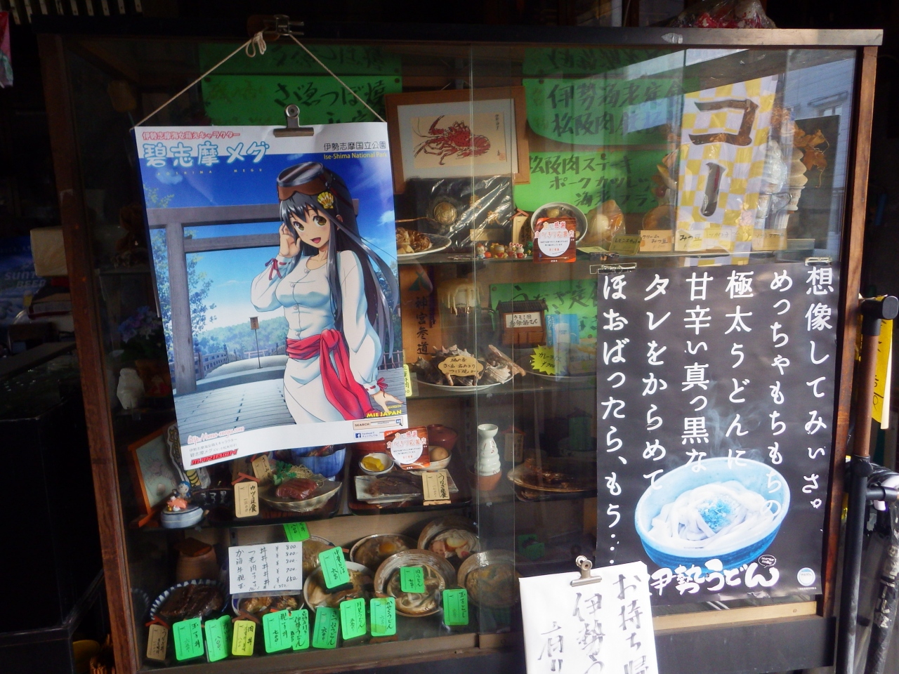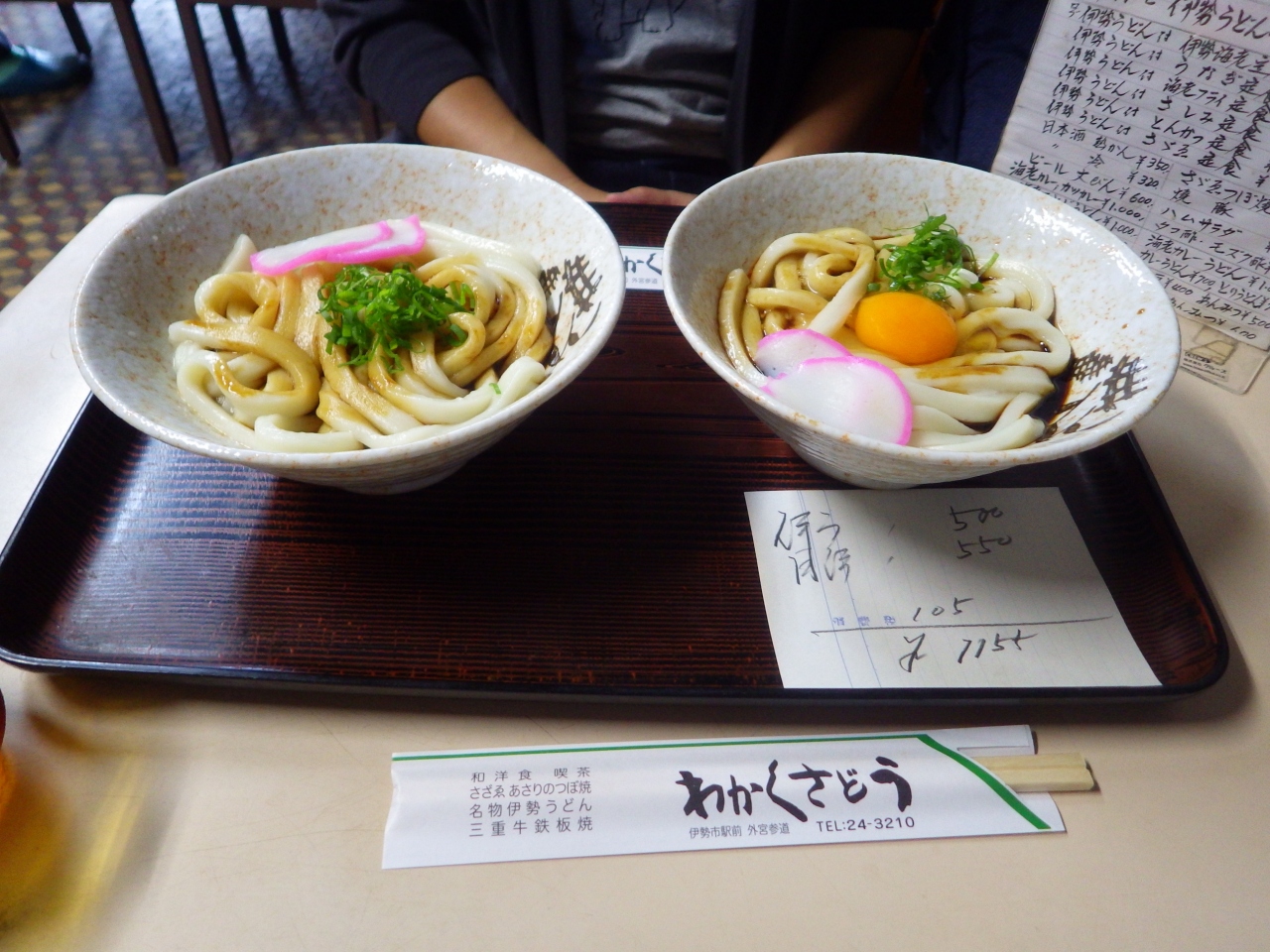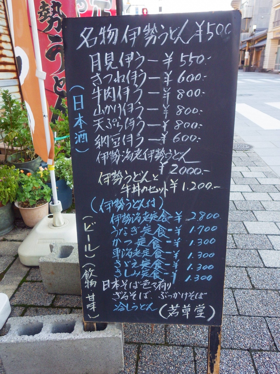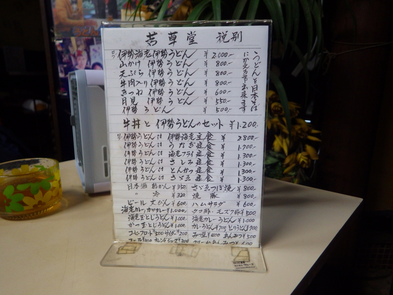 メニューは、伊勢うどん、丼もの、伊勢うどん付定食、伊勢うどんと牛丼のセット(1,200円)などです。もちろん、伊勢うどん(500円)を注文、太くて、柔らかくて、もちもちしていて、消化も良さそうです。懐かしいものを眺めながら美味しくいただきした。- 旅行時期