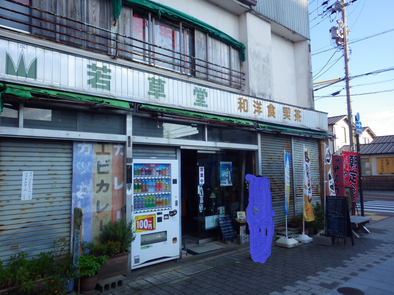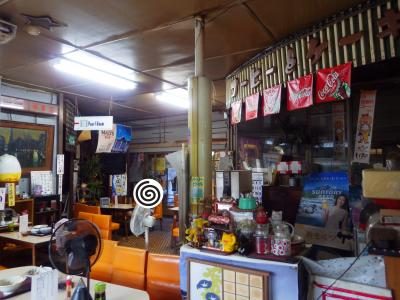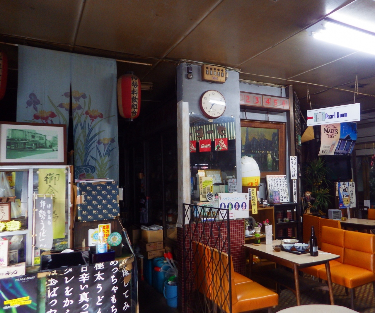 ほとんどのシャッターが閉まっている古びた外観に足が竦みました。「朝定食」「伊勢うどん」などの旗や手書きのメニューが外に出ていたので、営業していることはわかりました。ちょっと薄暗い店内に入ると、すべてが昭和レトロでした。内装、椅子、テーブル、食器、飾り物、何もかも。古い物や雑然としているのが苦手な人もいるかもしれません。