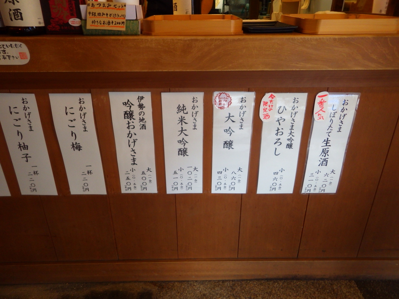 一番人気「おかげさま しぼりたて 生原酒」(小310円)と今だけの限定酒「おかげさま 大吟醸 ひやおろし」(小460円)を注文しました。キリリとしていて、空きっ腹に染み込みました。外で販売している冷たい甘酒も気になりました。お伊勢参りでは、我が家のリピートです。- 旅行時期