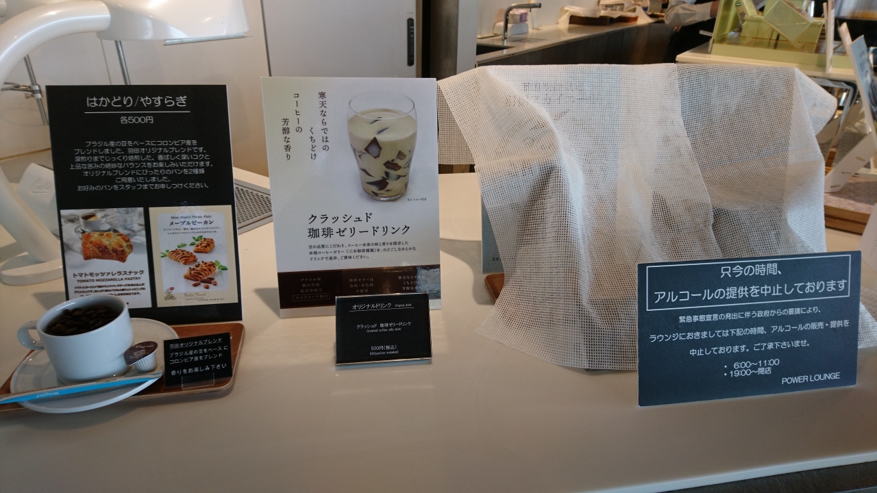 現在は飲食の持ち込み禁止、ラウンジ内で販売されている食べ物のみ食べることができます。笹寿司(250円)、羽田オリジナルブレンドコーヒーとパンのセット(500円)、クラッシュド珈琲ゼリードリンク(500円)が有料でした。他にも土産用のクッキー、チョコレート、珈琲も販売されています。