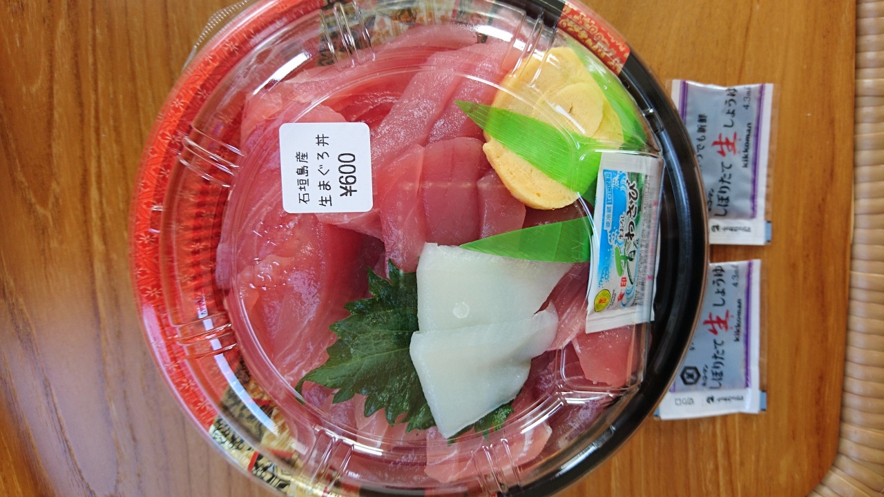 12時オープン、15時半頃に行ったので、石垣島産のマグロのさしみは売り切れでした。売り切れと聞いた地元のおばさんが「石垣島産 生まぐろ丼」(600円)を手に取ったので、迷わず残り1つをゲットしました。厚切りのマグロが重なるようにギッシリのっており、ご飯に辿りつけないぐらい食べ応えがありました。