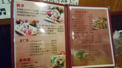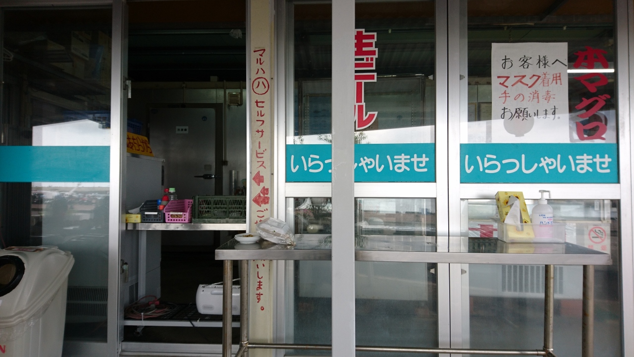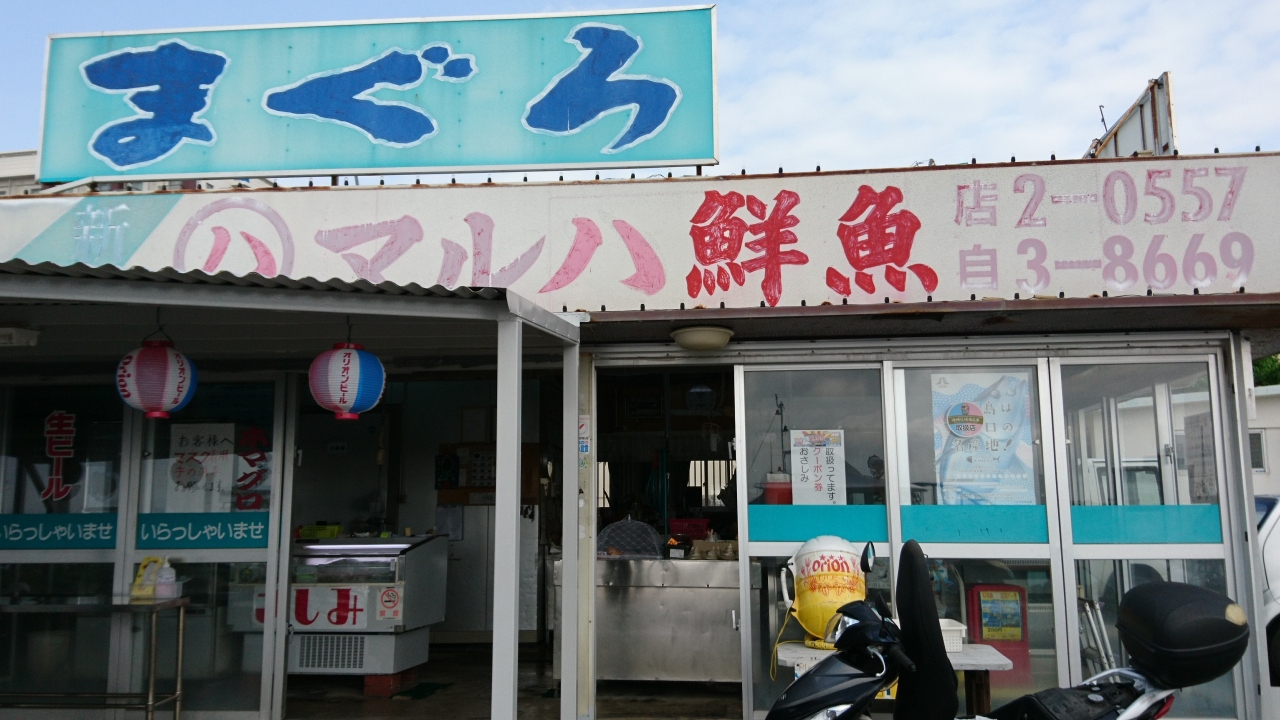 離島ターミナル近くの鮮魚店(さしみ屋)です。「まぐろ」と書いた大きな看板のとおり、マグロの販売がメインのようです。「こちらでお刺身がいただけます」と看板にあり、店先のテーブルでビールを飲みながらマグロの刺身を食べている人いて、入りやすかったです。