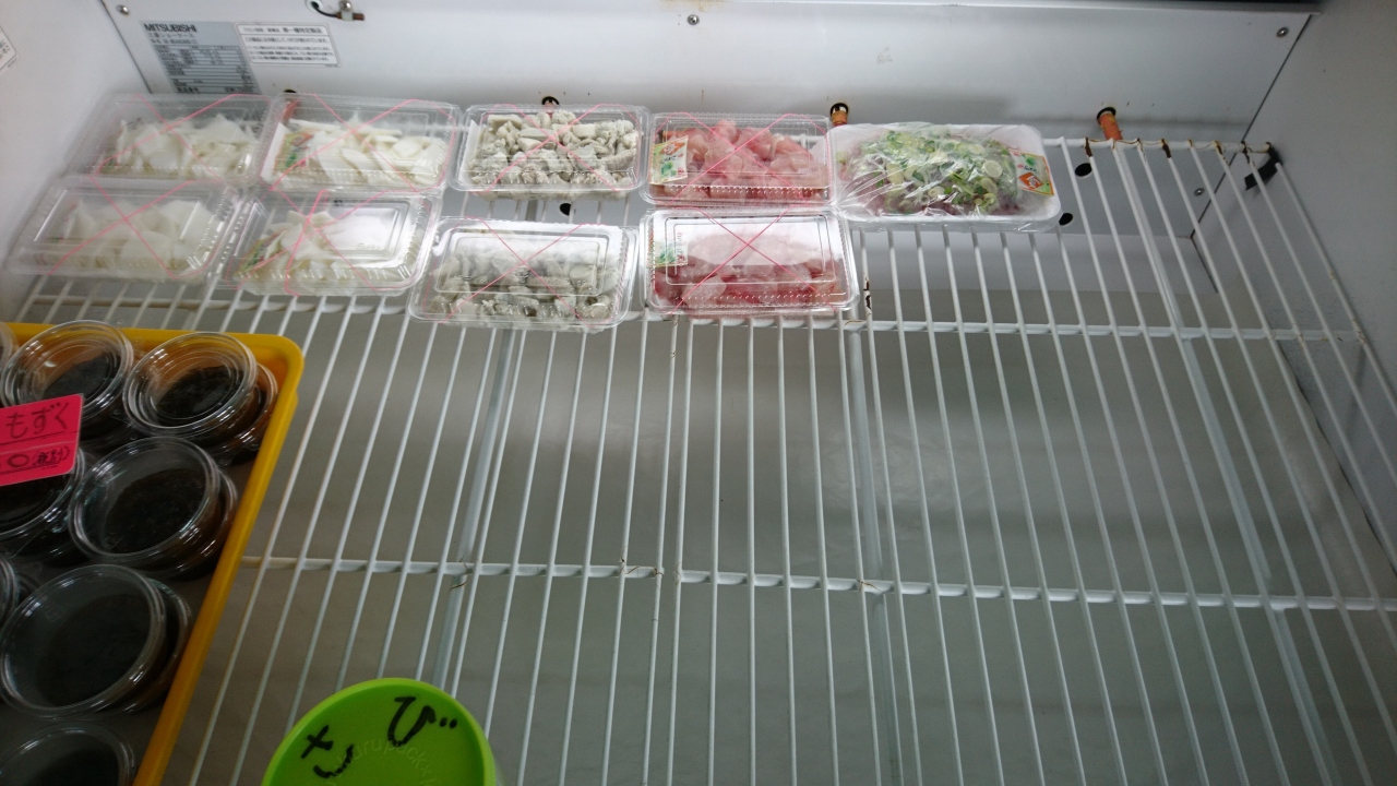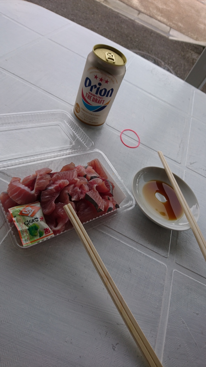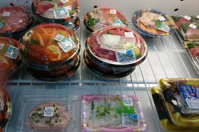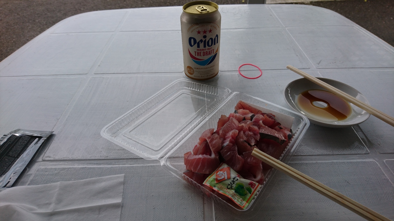 ショーケースの中にパック詰めされたマグロの切り落とし、マグロの中落ち、(おそらく)イカの刺身などがあり、すべて500円でした。もずくは200円です。テーブルの上には魚の天ぷらも。11時頃に行った時に見た美味しそうなマグロの切り落としは、翌日の13時頃には無く、筋と皮付のマグロの切り落としが販売されており残念でしたが、せっかくなので、缶ビールも買い、店先で港を見ながらいただきました。新鮮で美味しいのですが、多すぎて途中から若干飽きてしまいました。