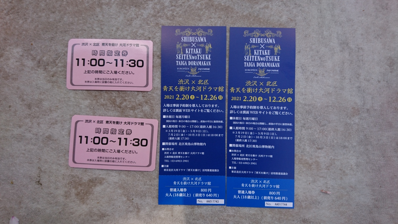 渋沢資料館と渋沢庭園内の「晩香廬」「青淵文庫」は事前予約制、すでに当面の予約はいっぱいで断念しました。「北区飛鳥山博物館」内に「渋沢×北区 晴天を衝け 大河ドラマ館」が開館されています。こちらも事前予約制、オンライン販売を推奨していますが、当日チケットカウンターで購入可能でした。