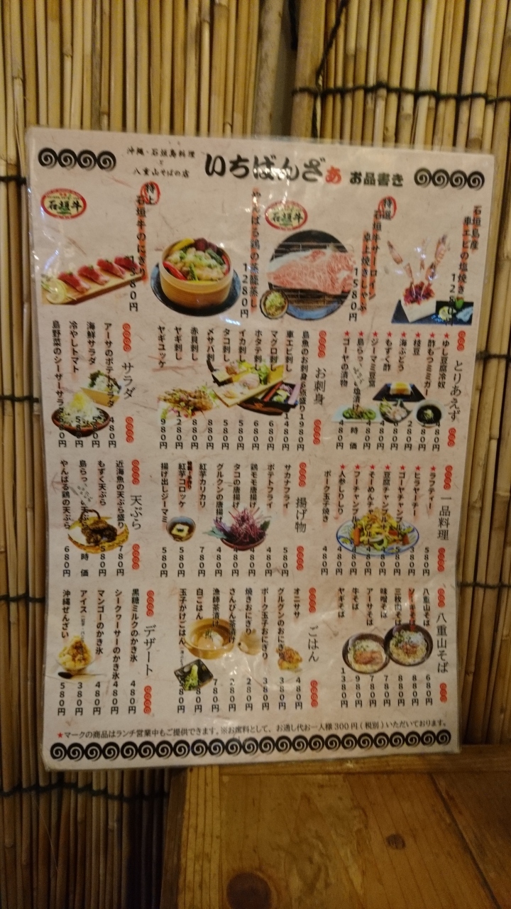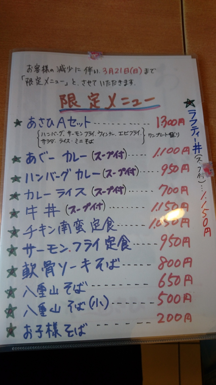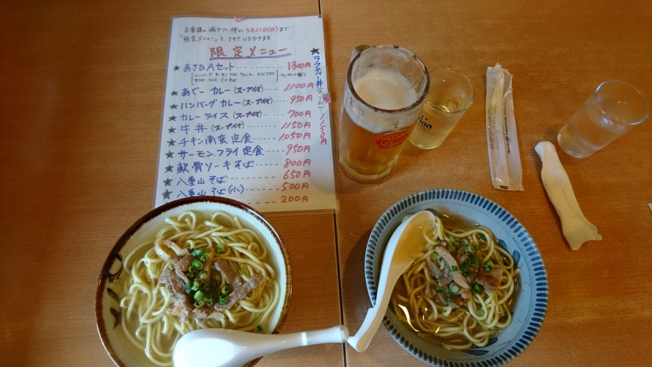 入口の「お客様の減少に伴い、3月31日(日)まで限定メニューとさせていただきます。」という張り紙を見ずに入店してしまいました。限定メニューの中で「軟骨ソーキそば」(800円)を注文したところ品切れ、「八重山そば」(650円)「八重山そば(小)」(500円)「生ビール」(600円)を注文、「八重山そば」は小で十分でした。