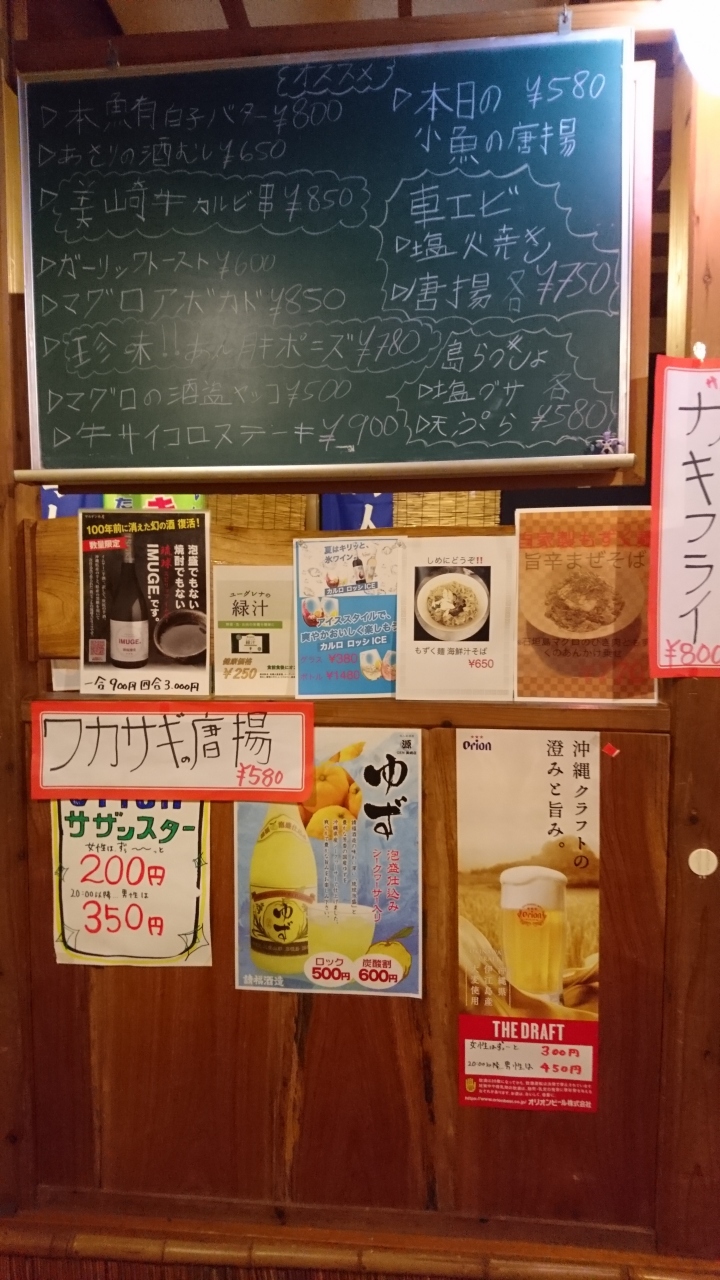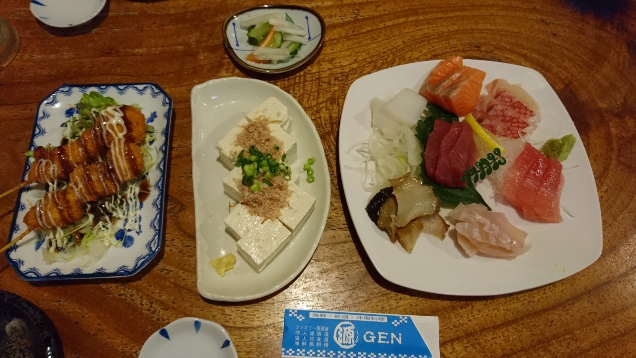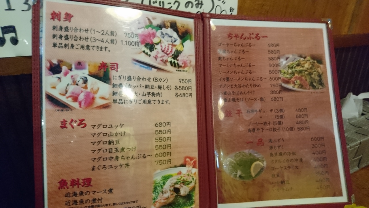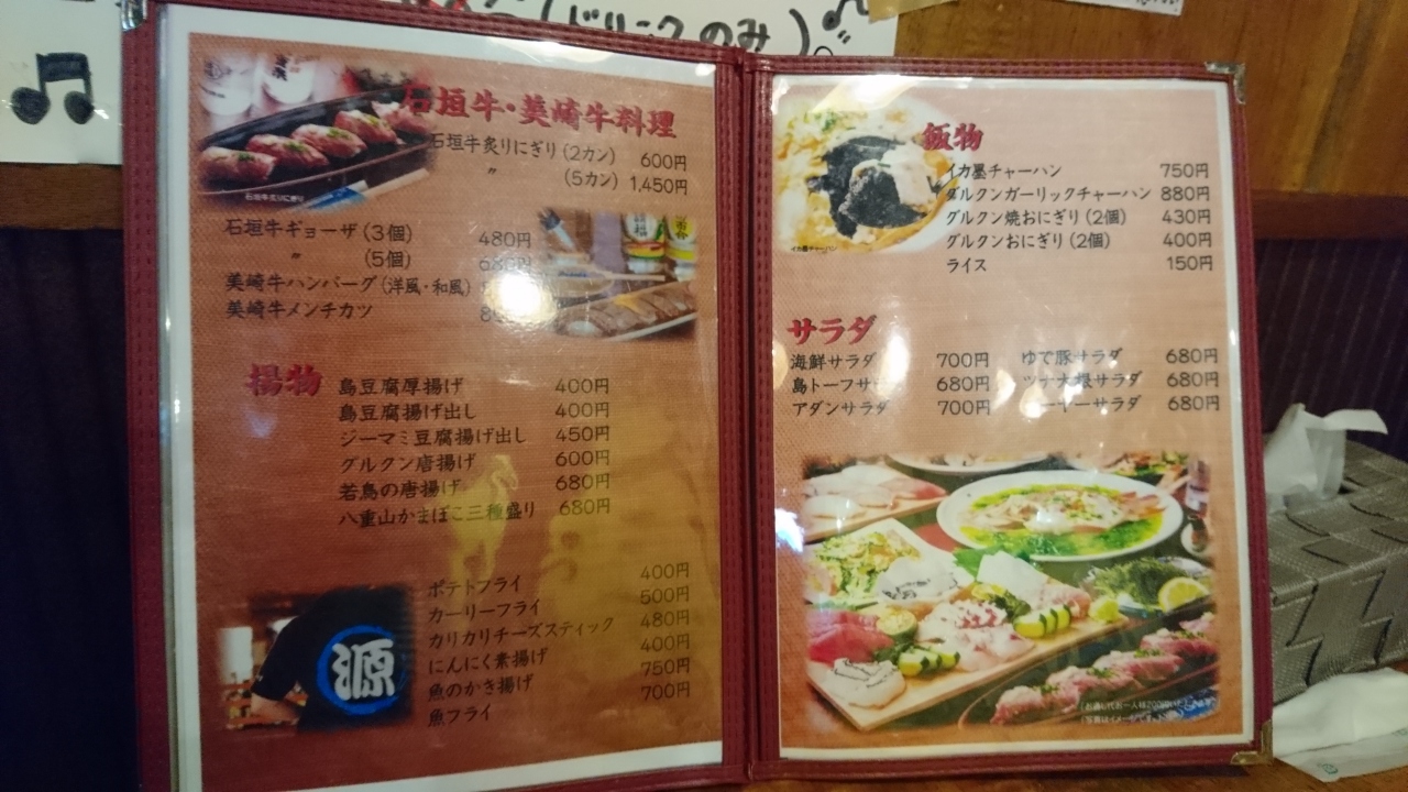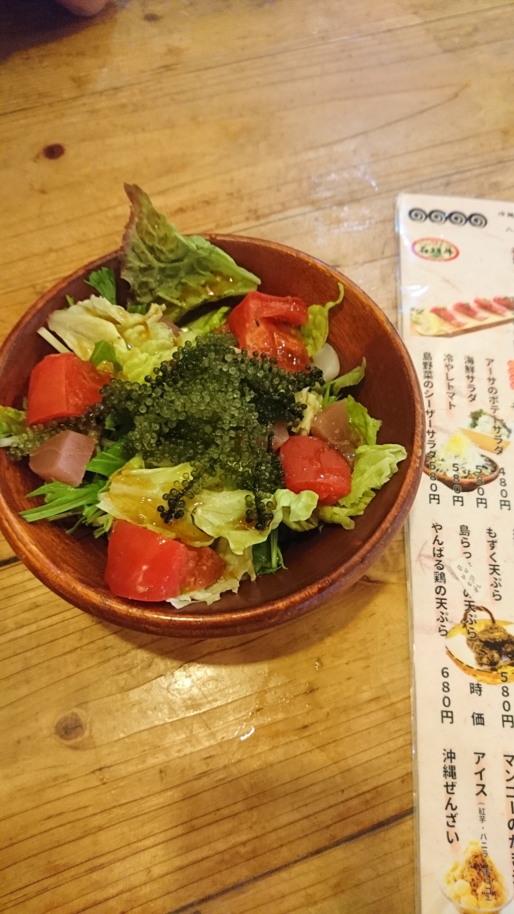 お通しにキムチの小鉢が出てきてビックリ!沖縄料理の店なのに!!一般的な沖縄料理のメニューは一通りありますが、島らっきょうの酢漬けと島らっきょうの天ぷらには、「品切れ」のテープが貼ってありました。楽しみにしていた石垣牛のにぎりとラフティーも品切れと。肉モードだっただけに、若干物足りなさが残りました。アルコール類の他に、海鮮サラダ(580円)、もずく天ぷら(580円)、ジーマミ豆腐(480円)、フーチャンプル(480円)、グルクンの唐揚げ(480円)を注文しました。海鮮サラダと言っても海ぶどうと細かく切った刺身が少しだけでで、失敗でした。お刺身はファミマで買ったし、島魚のお刺身6点盛り1,980円は、離島ターミナル付近の居酒屋の倍のお値段なので、注文しませんでした。となりのテーブルで注文した刺身盛り合わせを見て、自分の選択が正しいことを確信しました。