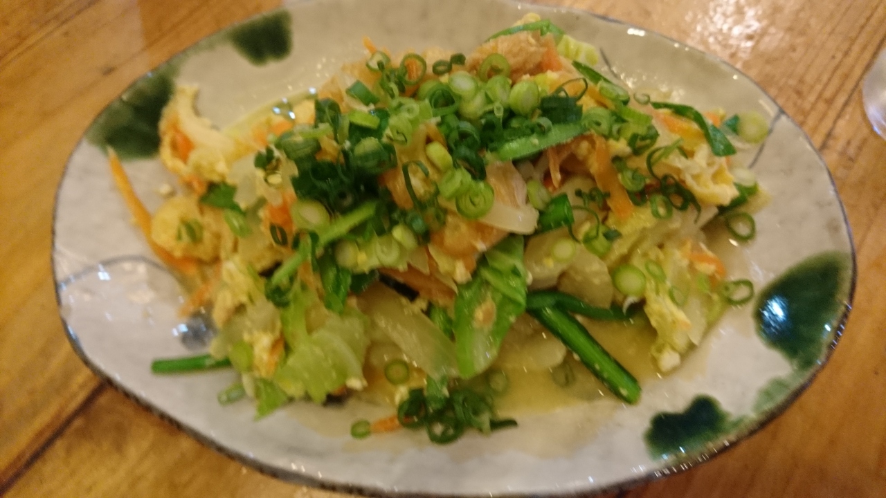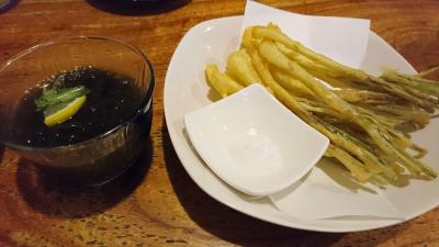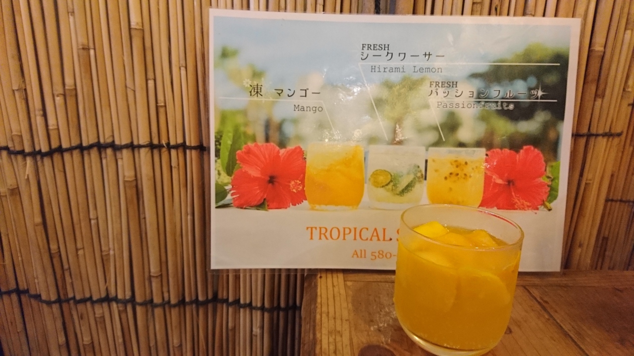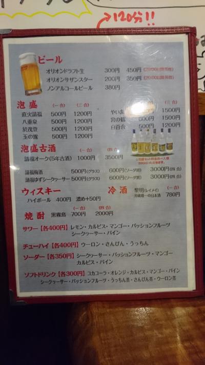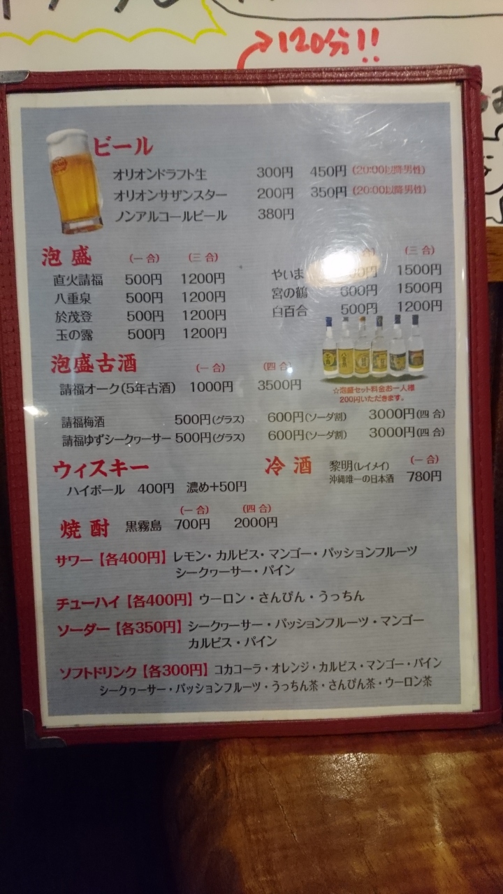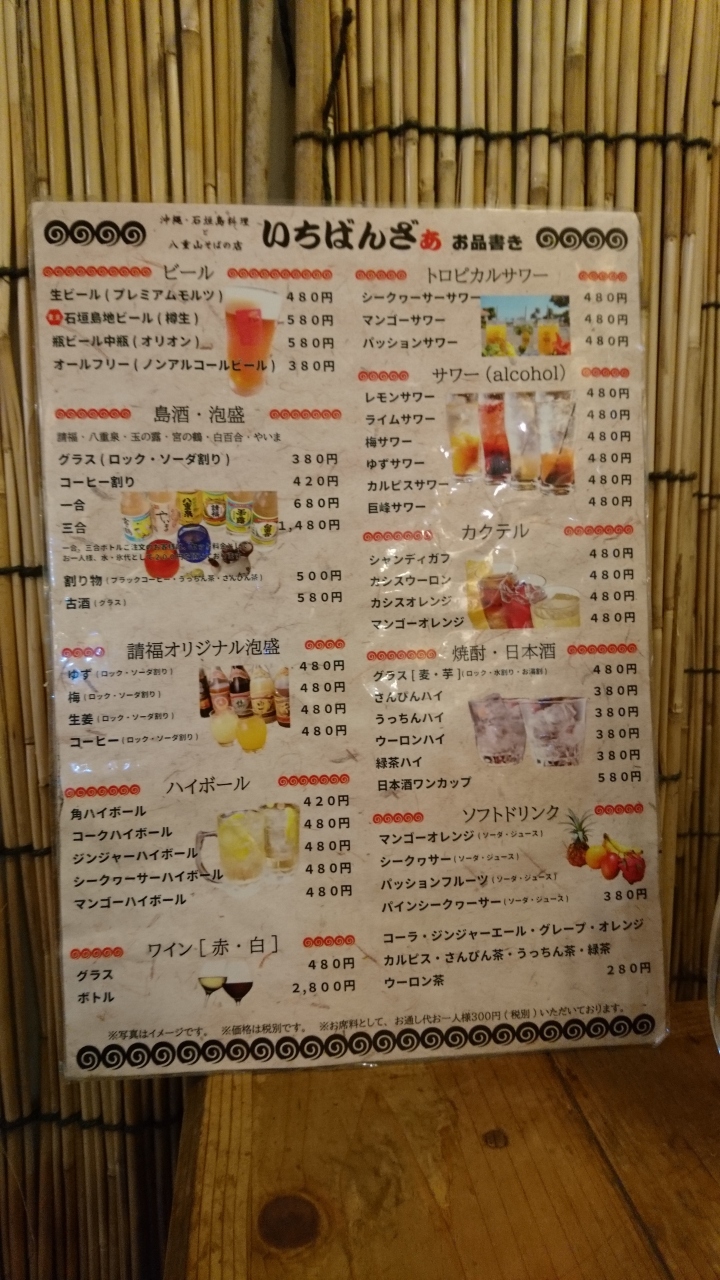 お通しにキムチの小鉢が出てきてビックリ!沖縄料理の店なのに!!一般的な沖縄料理のメニューは一通りありますが、島らっきょうの酢漬けと島らっきょうの天ぷらには、「品切れ」のテープが貼ってありました。楽しみにしていた石垣牛のにぎりとラフティーも品切れと。肉モードだっただけに、若干物足りなさが残りました。アルコール類の他に、海鮮サラダ(580円)、もずく天ぷら(580円)、ジーマミ豆腐(480円)、フーチャンプル(480円)、グルクンの唐揚げ(480円)を注文しました。海鮮サラダと言っても海ぶどうと細かく切った刺身が少しだけでで、失敗でした。お刺身はファミマで買ったし、島魚のお刺身6点盛り1,980円は、離島ターミナル付近の居酒屋の倍のお値段なので、注文しませんでした。となりのテーブルで注文した刺身盛り合わせを見て、自分の選択が正しいことを確信しました。