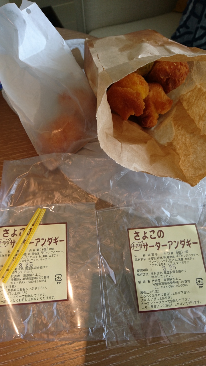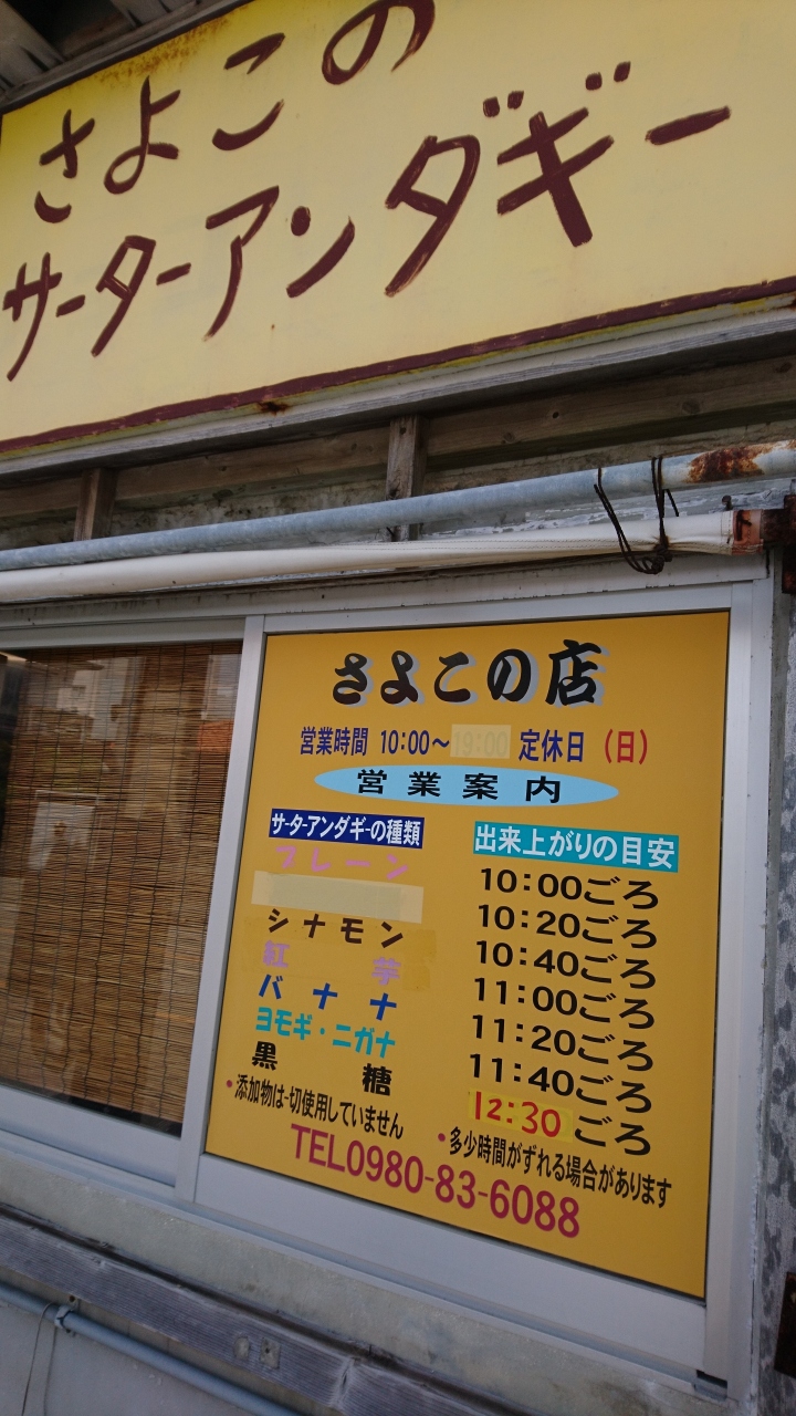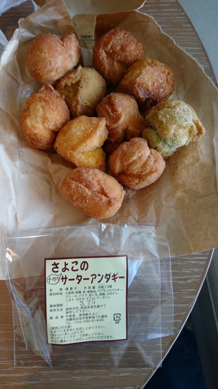 ガイドブックにも掲載されているサーターアンダギーの製造販売店です。730交差点から約400メートル、赤瓦の特徴的な建物の窓ガラスには、サーターアンダギーの種類と焼き上がりの目処が貼ってあります。通常は7種類のようですが、当日は6種類で、うち5種類が焼き上がっていました。2週間日持ちするし、小ぶりなので、5種類を2個ずつ購入しました。店員さんが注文の品をまとめて紙袋に入れてくれ、5個以上購入するとお土産用の小分けビニール袋ももらえます。評判通り、外はカリカリ、中はフワフワでした。そして揚げたては格別でした。お土産にもオススメです。