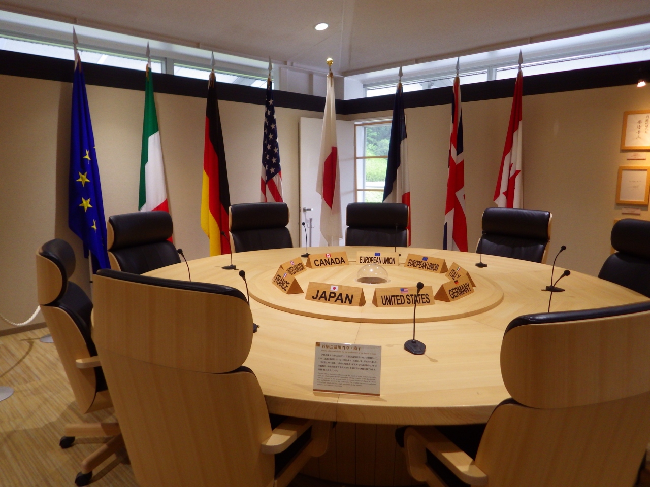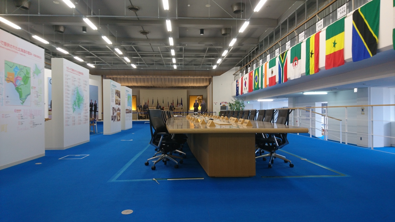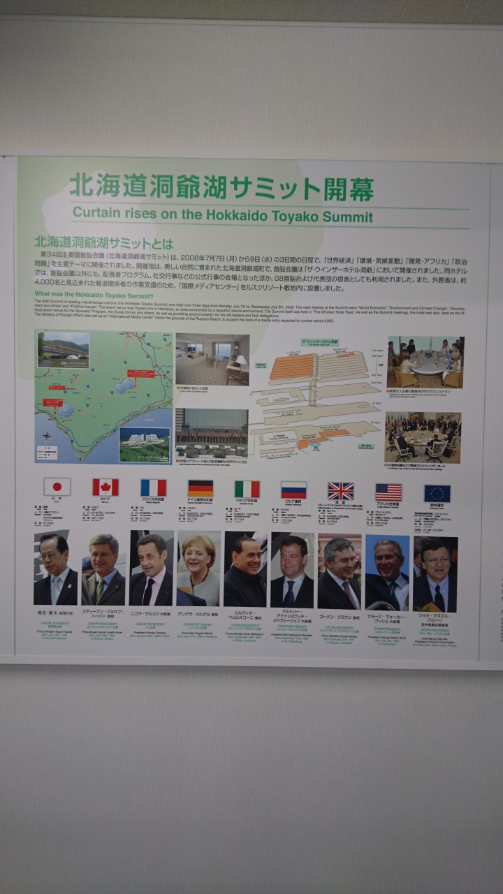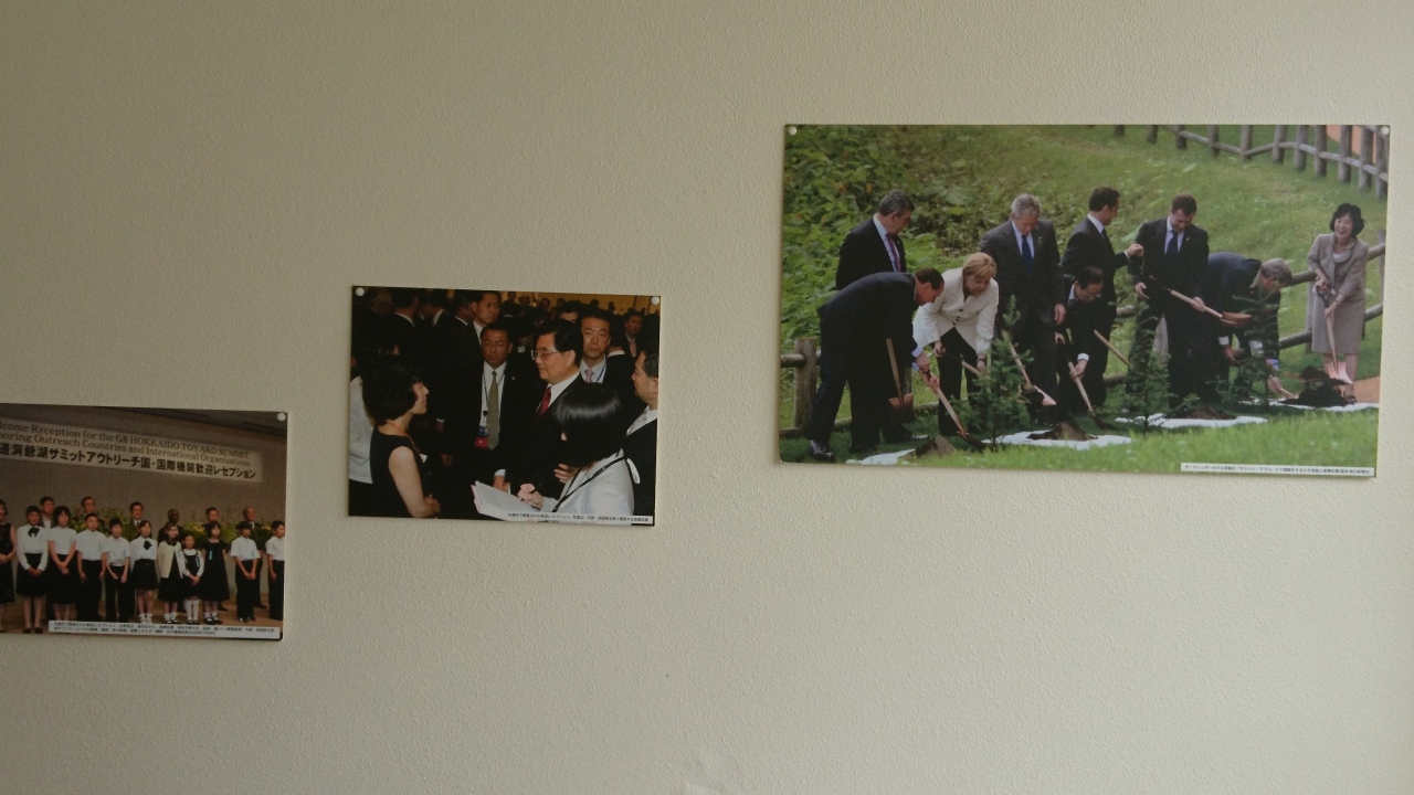 実際にサミットで使用されたテーブルやイス、サミット関連の資料や写真が展示されています。イスに座って記念撮影ができます。