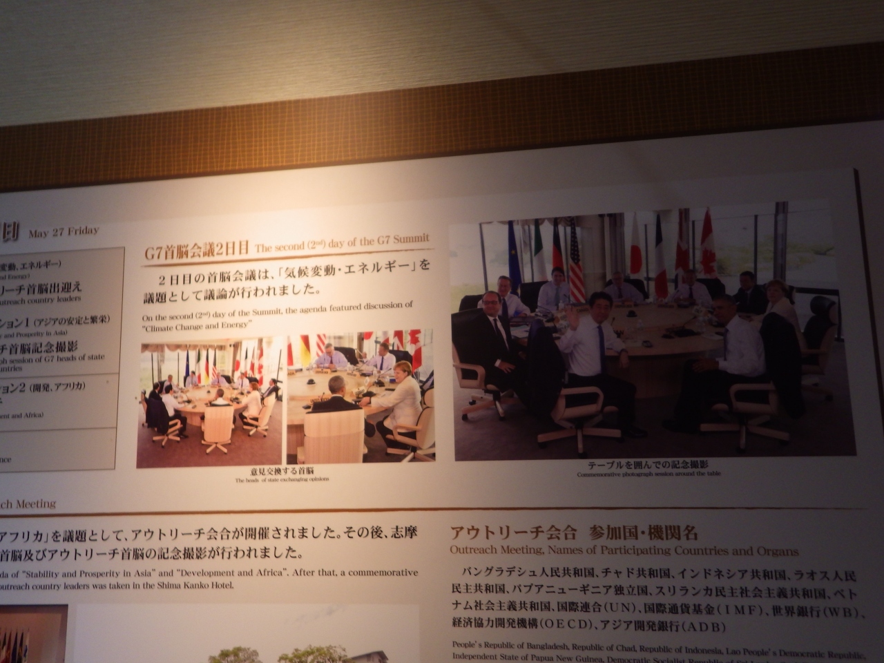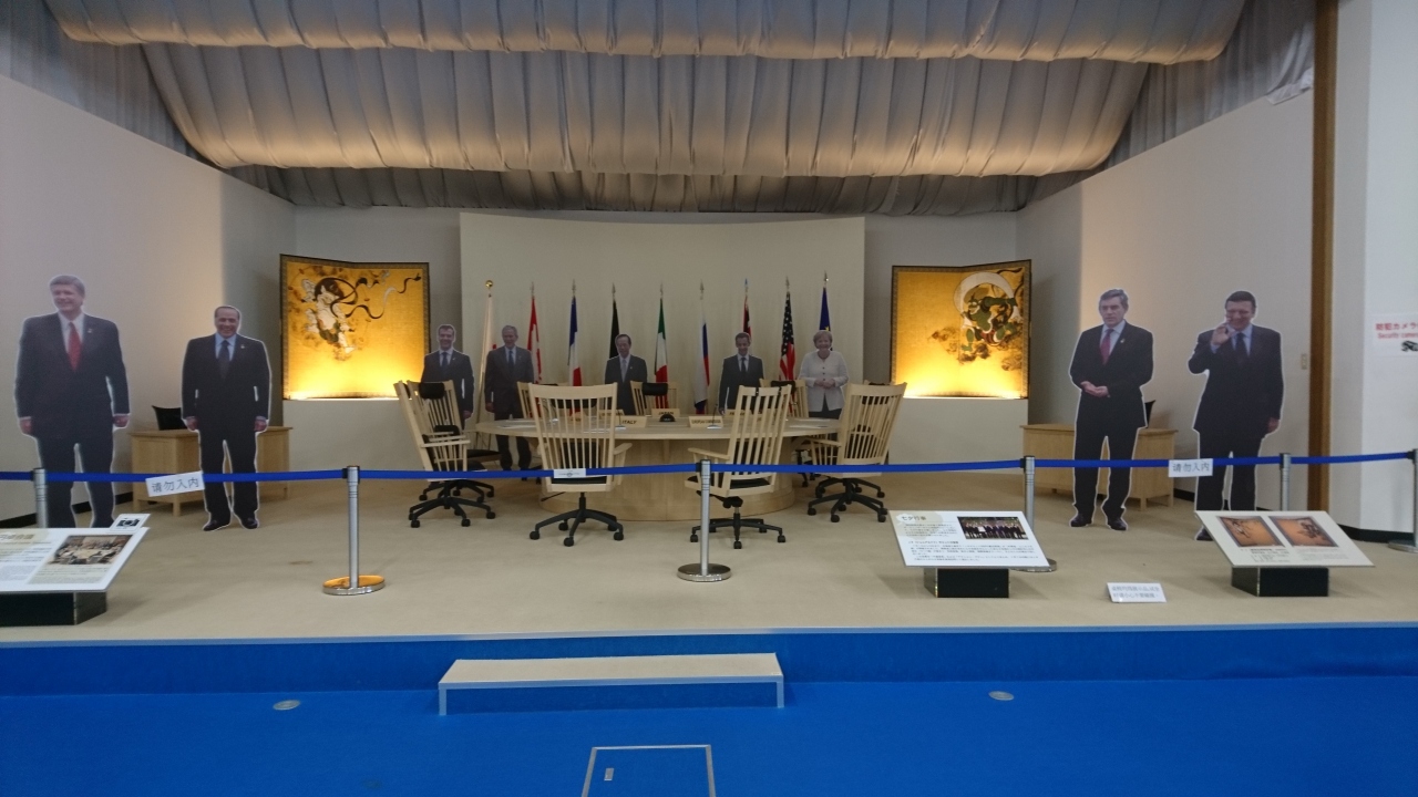 入口には、G7首相の等身大のパネルがあり、記念撮影をしました。首脳会議で実際に使われた円卓と椅子が展示されています。パンフには「実際に椅子に座って記念撮影もできます」と書いてありますが、実際はロープで囲われており、触れられません。