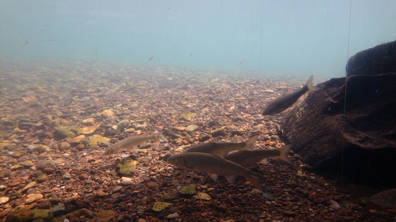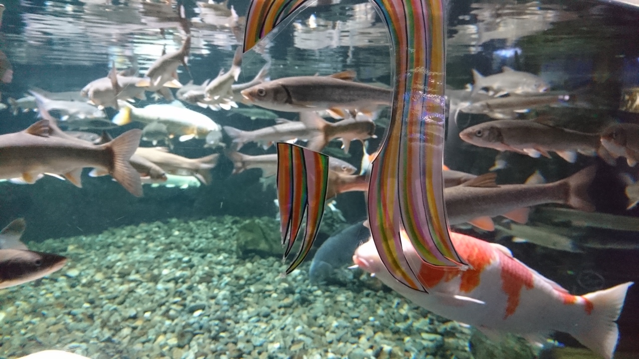 地下にある水中観測ゾーンは千歳川の中に作られており、設置された窓から直接水中を観察できるという、外の水族館にはない特色があります。みなさん、食い入るように窓の外を見ていました。