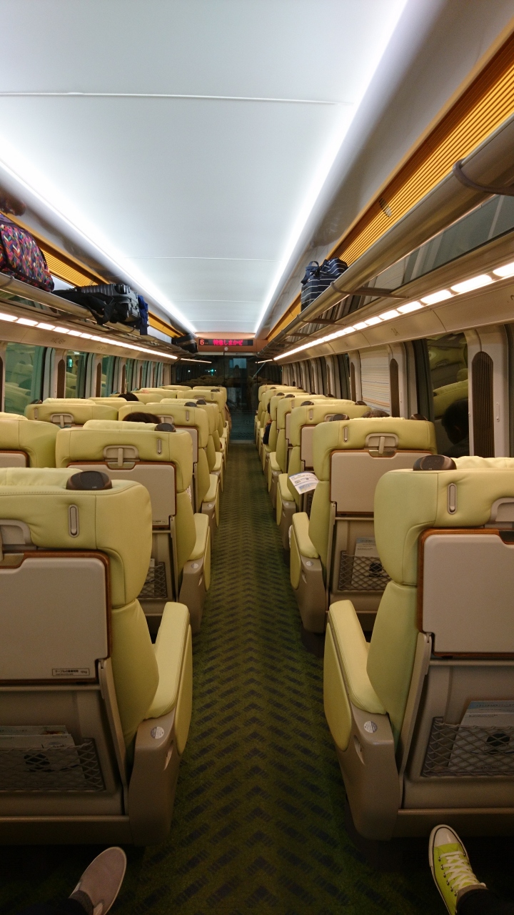 プレミアムシートは1列と2列の間に通路があり、座席は高級感のある本革で、幅も足下もすごく広くて快適でした。リクライニングも自動で、窓も大きいので、ゆったりと景色を眺めることができます。