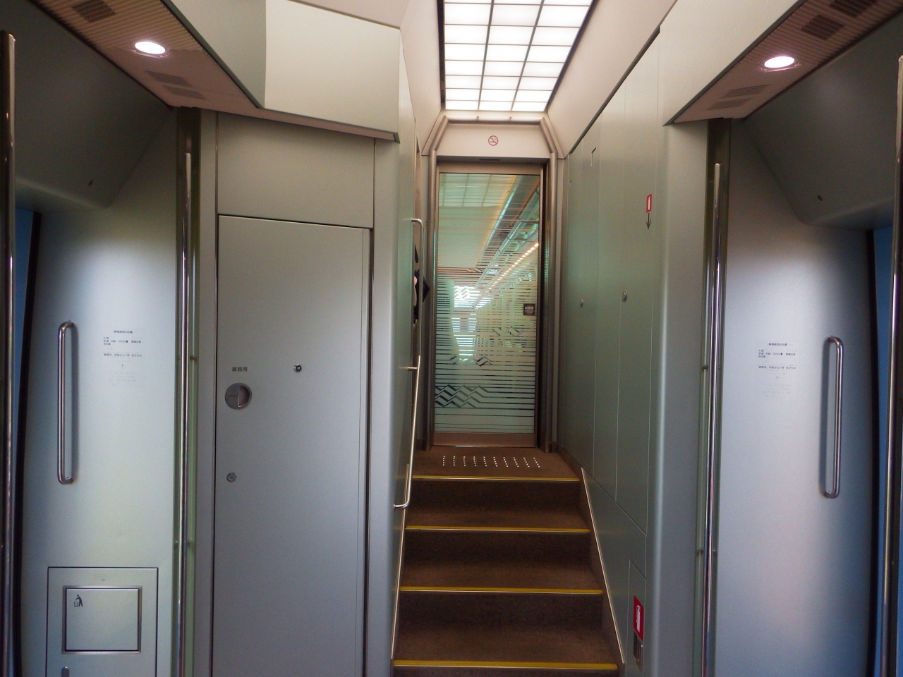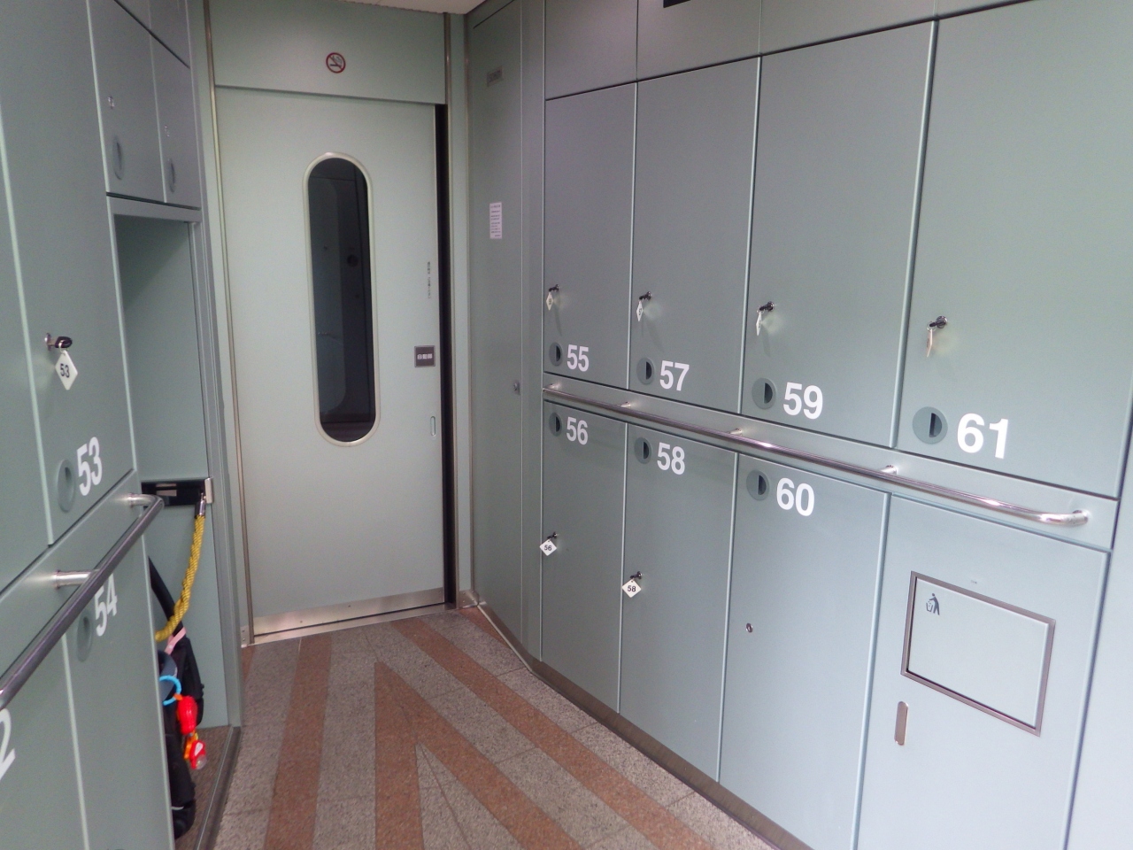 座席付近には大きな荷物を置くことはできませんが、別の場所に鍵付きのロッカーがあります。客室車両は高くなっており、車両と車両の間には階段があります。