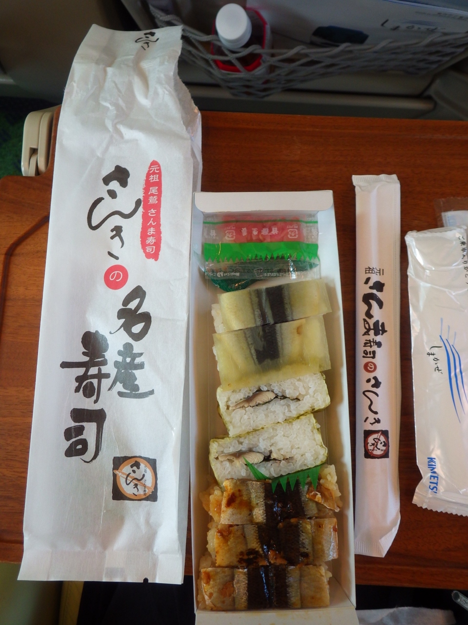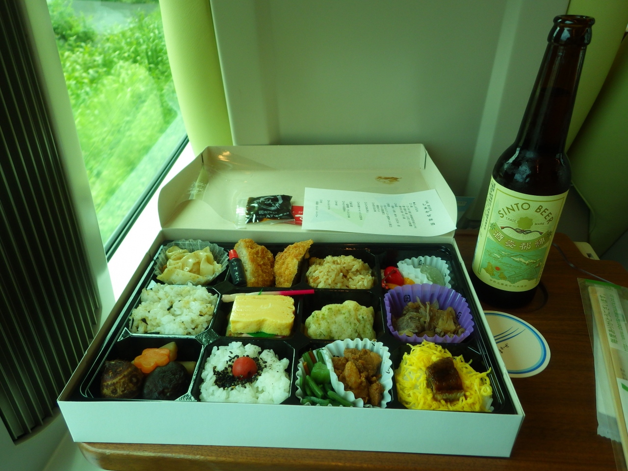 しまかぜ弁当(1,240円)と三重・尾鷲の押し寿司(1,200円)、地ビール(590円)を注文、しまかぜ弁当は地元食材を使った幕の内弁当で、この季節の押し寿司は三種類のサンマの押し寿司でした。