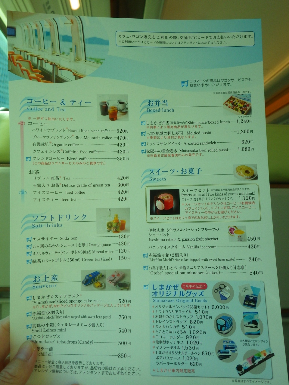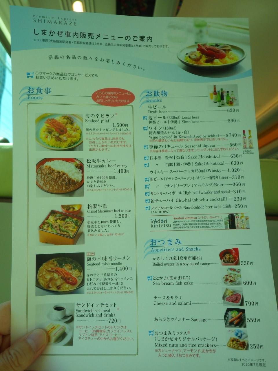 カフェ車両もあり、窓側に向いた席で景色を見ながらランチやスイーツを楽しむことができますが、座席数が少なく、すぐに満席になっていました。カフェの入口では、ワゴン販売と同じように、ドリンク(アルコールあり)、お弁当、お土産などが販売されています。ワゴン販売は時間がかかるし、お弁当が売り切れになる可能性もあります。当日は、松坂牛の黄金巻き(近鉄名古屋発着便のみ発売)が人気あり、ワゴン販売の方が注文の都度、カフェに在庫確認をしていました。