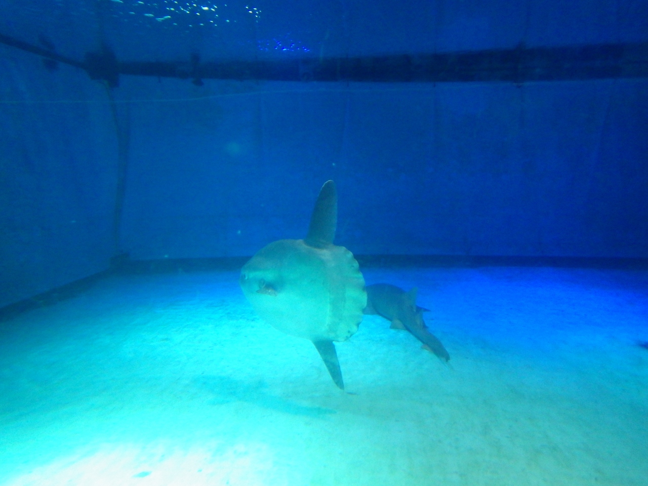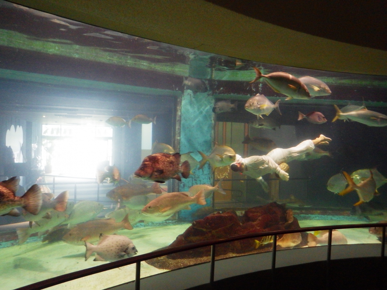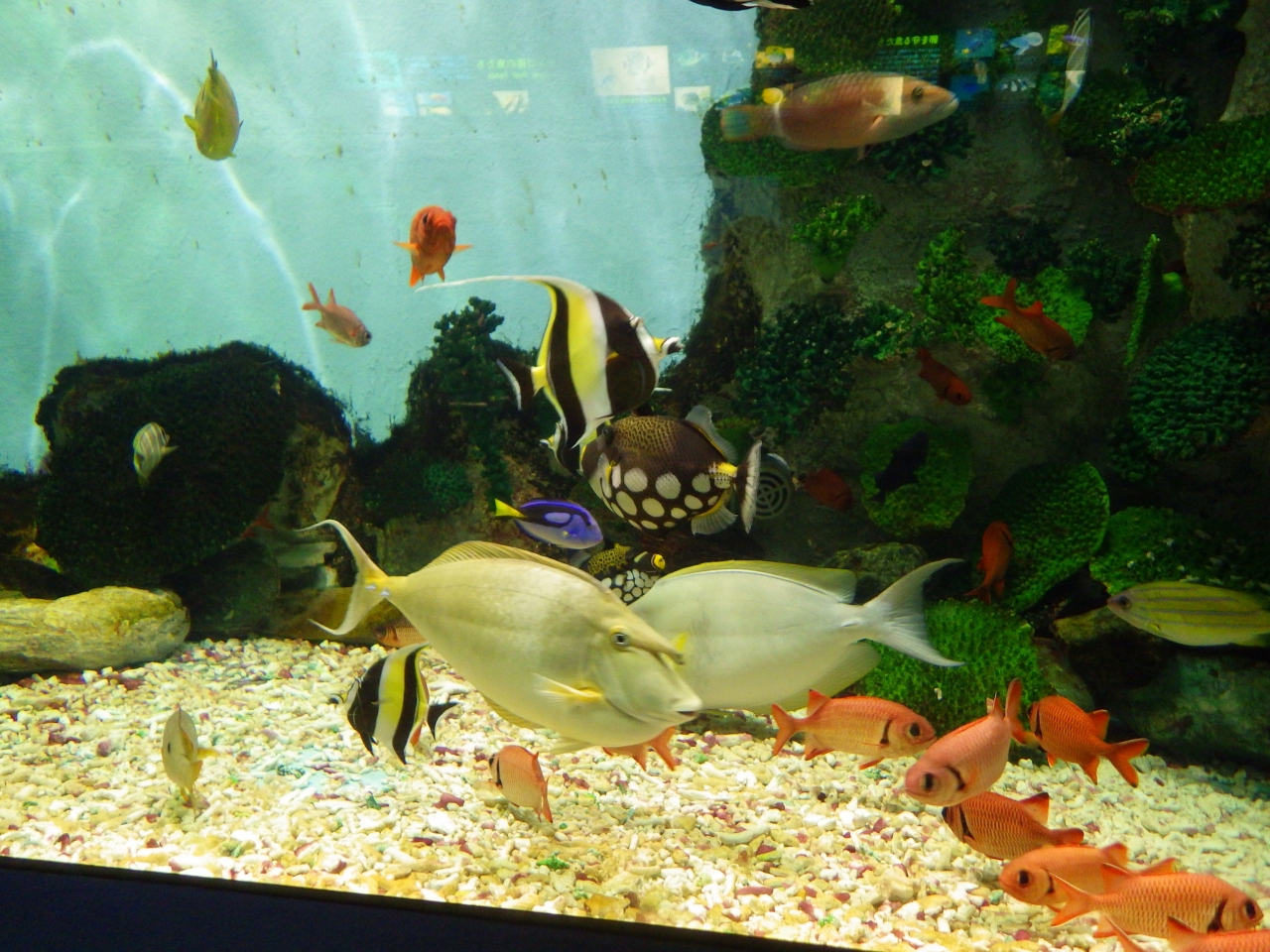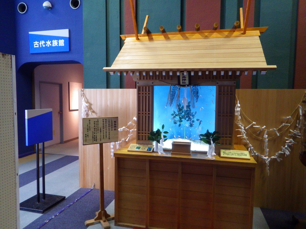 大きなマンボーがのんびり泳いでおり、アンモナイトなどの化石の展示、賢島神社もあります。学力向上や知力アップの御利益があるようです。もちろん、珊瑚礁の海に生息するきれいな魚、かわいい魚も展示されています。
