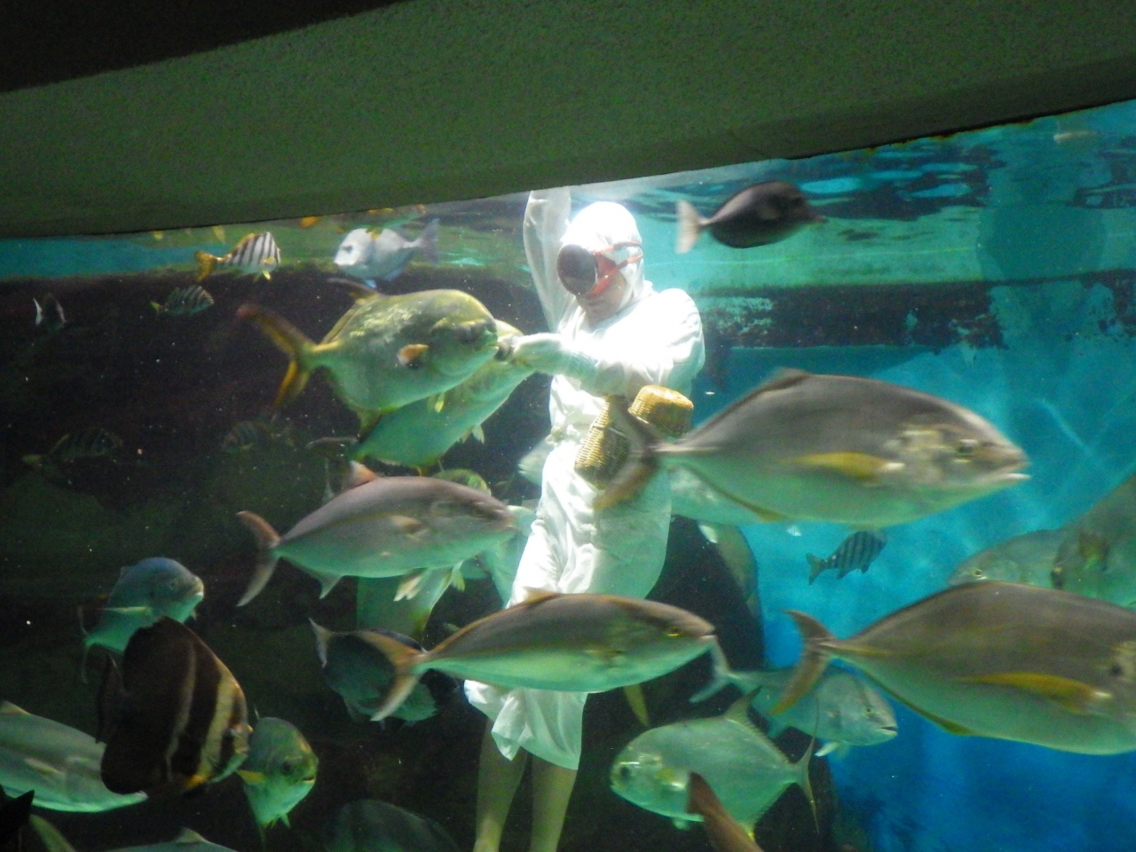 海女の餌やりは、ドーナッツ型の回遊水槽に白い磯着姿の海女さんが入り、泳ぎながらエサをあげると、沢山の魚が寄ってきます。海女さんが泳いだり潜ったりする姿も素敵でした。