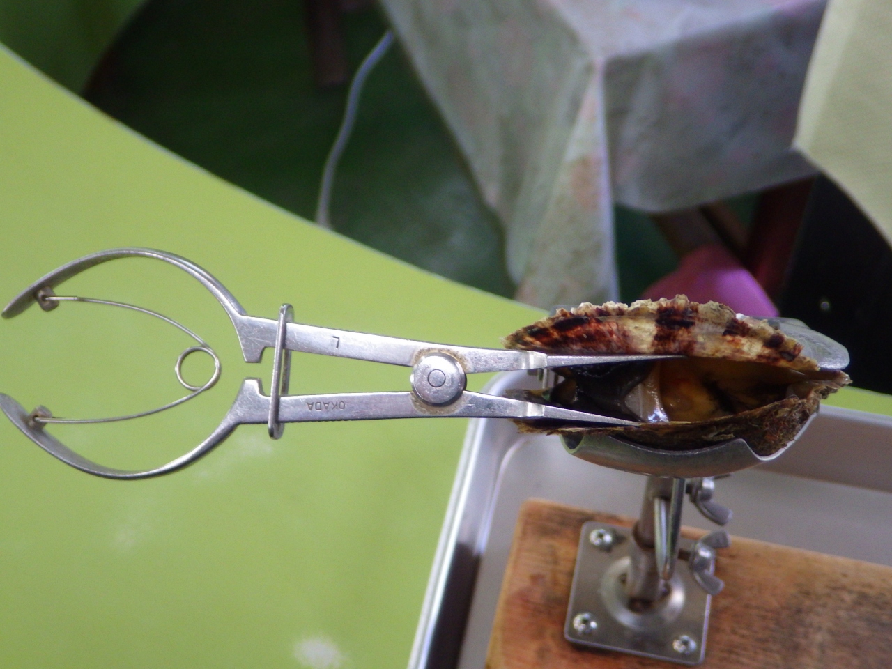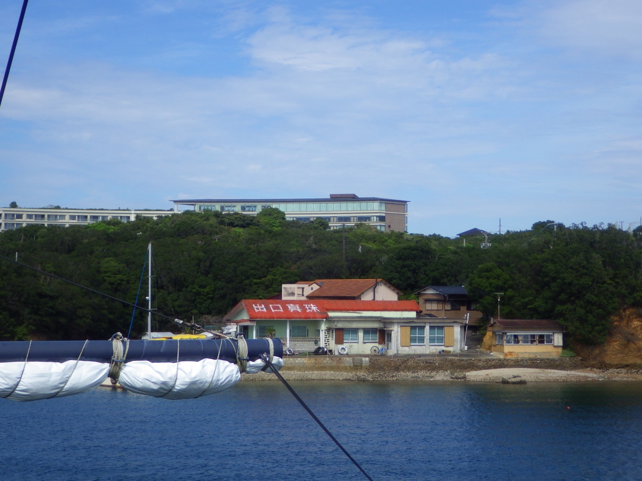 出口真珠という真珠モデル工場に立ち寄り、養殖真珠の核入れ作業の見学ができ、みなさん食い入るように見入っていました。真珠製品の販売もありました。