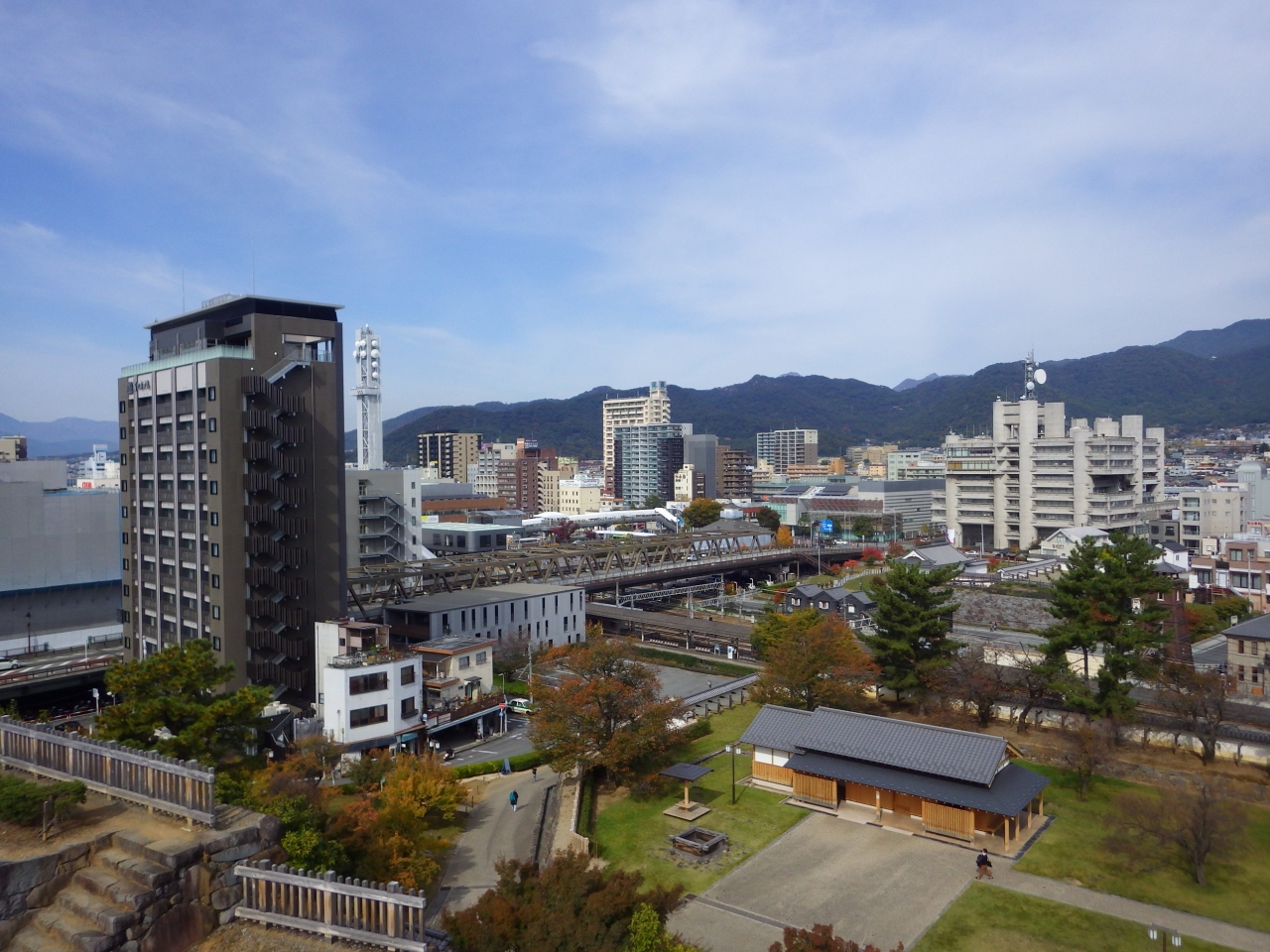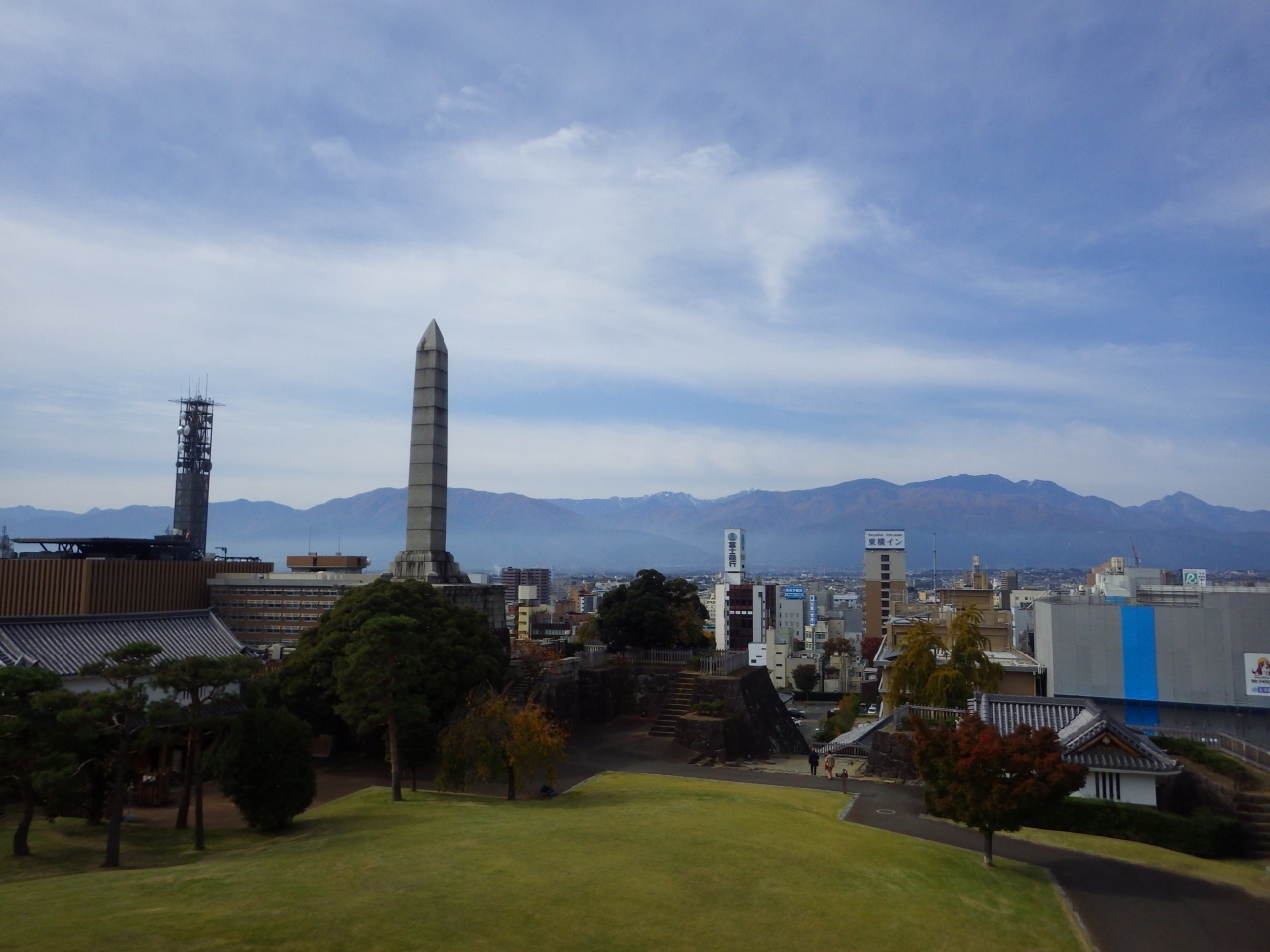 甲府城跡の一部が「舞鶴城公園」「甲府市歴史公園」として開放されており、芝生の上を散策したり、遠くの山々を眺めたりしました。- 旅行時期