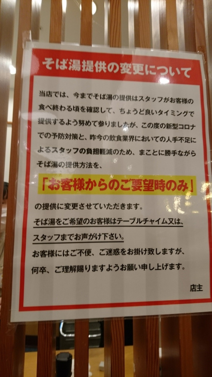「そば湯提供の変更について」という張り紙があり、そば湯の提供はお客様からのご要望時のみとなっているので、お願いしました。そば湯を使わない人もいるので、いいシステムだと思いました。