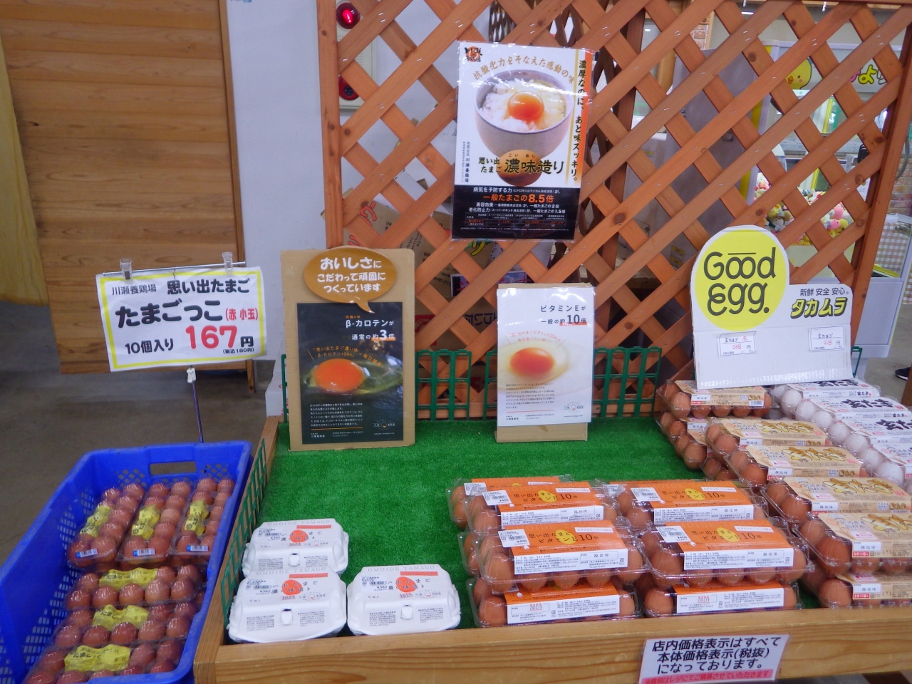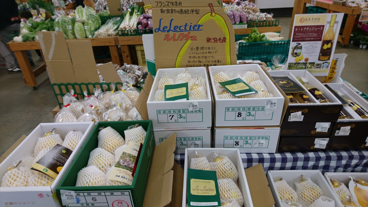 農産物直売所では、地元で収穫された新鮮な野菜、果物、花の他に、お酒やお土産も販売されていました。ホテルの朝食で食べた「思い出たまご 濃味づくり」も販売されていました。新潟名産ル・レクチェ(高級洋梨)がバラ売りされていたので、購入してみました。