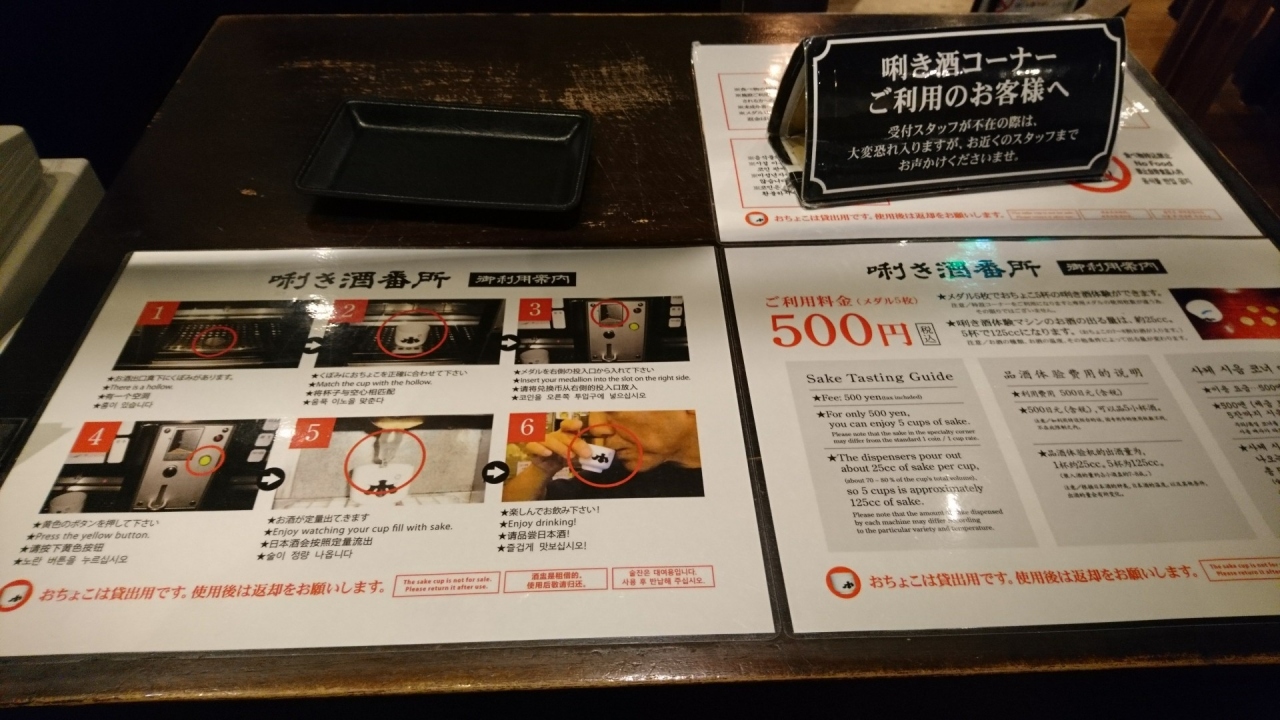 ぽんしゅ館の一部が「きき酒番所」となっており、500円でお猪口5杯分のきき酒をすることができます。受付で500円を支払い、お猪口とメダル5枚を受け取ります。お好みの銘柄のマシーンにお猪口をセット、メダルを投入しボタンを押すと日本酒が出てきます。100種類ぐらいあるので迷います。マシーンには銘柄に加え特徴も書かれていますが、スタッフのオススメや今月の一押し蔵などが黒板に書かれているので、参考にして選びました。少ないと思ったけど、飲み比べを楽しむにはちょうどいいかもしれません。日本酒好きには嬉しく楽しい場所です。再訪間違いなし。- 旅行時期