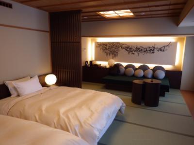 客室タイプは豊富で、予算や人数に応じて選べるようになっています。利用したリニューアルツイン(2020年5月リニューアル)は、畳の上にダブルベッド2台と大きなソファーがあり、インテリアがぶどうカラーで統一されており、落ち着いた雰囲気でした。素足で畳で過ごし、広いベッドで休むという和洋折衷が心地よかったです。広い洗面所には洗面台が2つ、椅子も設置されています。