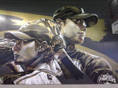 1Fのクラフトビール醸造レストラン「そらとしば by よなよなエール」の壁面にファイターズ50周年を記念したウォールアートがあり、ファイターズ創業オーナーとレジェンド監督・レジェンド選手が描かれていました。