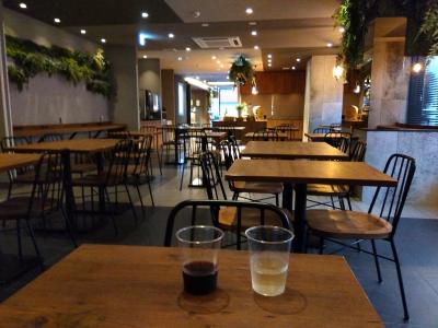 飲食物の持ちこみは可能なので、ダイニングエリアで美味しいビールとともにコンビニで購入した朝食を食べました。