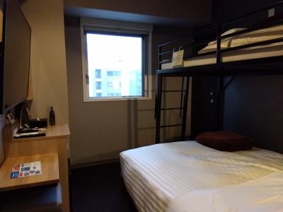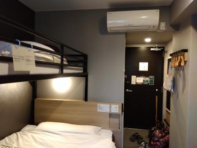 予約した客室はスーパールーム(上下型ツイン)の二段ベッド、上段のベッドは狭くてハシゴの登り降りが大変、下段のベッドは広くて寝心地がよく枕元に電源があり便利でした。