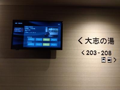 男女別天然温泉「大志の湯」は、15時から9時まで。広くはないけれど落ち着いた雰囲気でキレイ、旅の疲れが癒やされました。入口手前のモニターに利用状況が表示されていました。女性用のドアは、チェックイン時に渡されたメモに「暗証番号」で開けるようになっています。