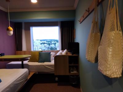 予約したスタジオルームは、ベッドがL字型に配置されていて、一つは窓側、もう一つは壁側です。ベッドの下に大きな荷物を置くことができるけれど、手荷物や小物を置いておくところがないのが不便でした。ベッドの間にあるテーブルを使う時はベッドに座らなければならず、室内にイスもなく使い勝手はよくなかったです。